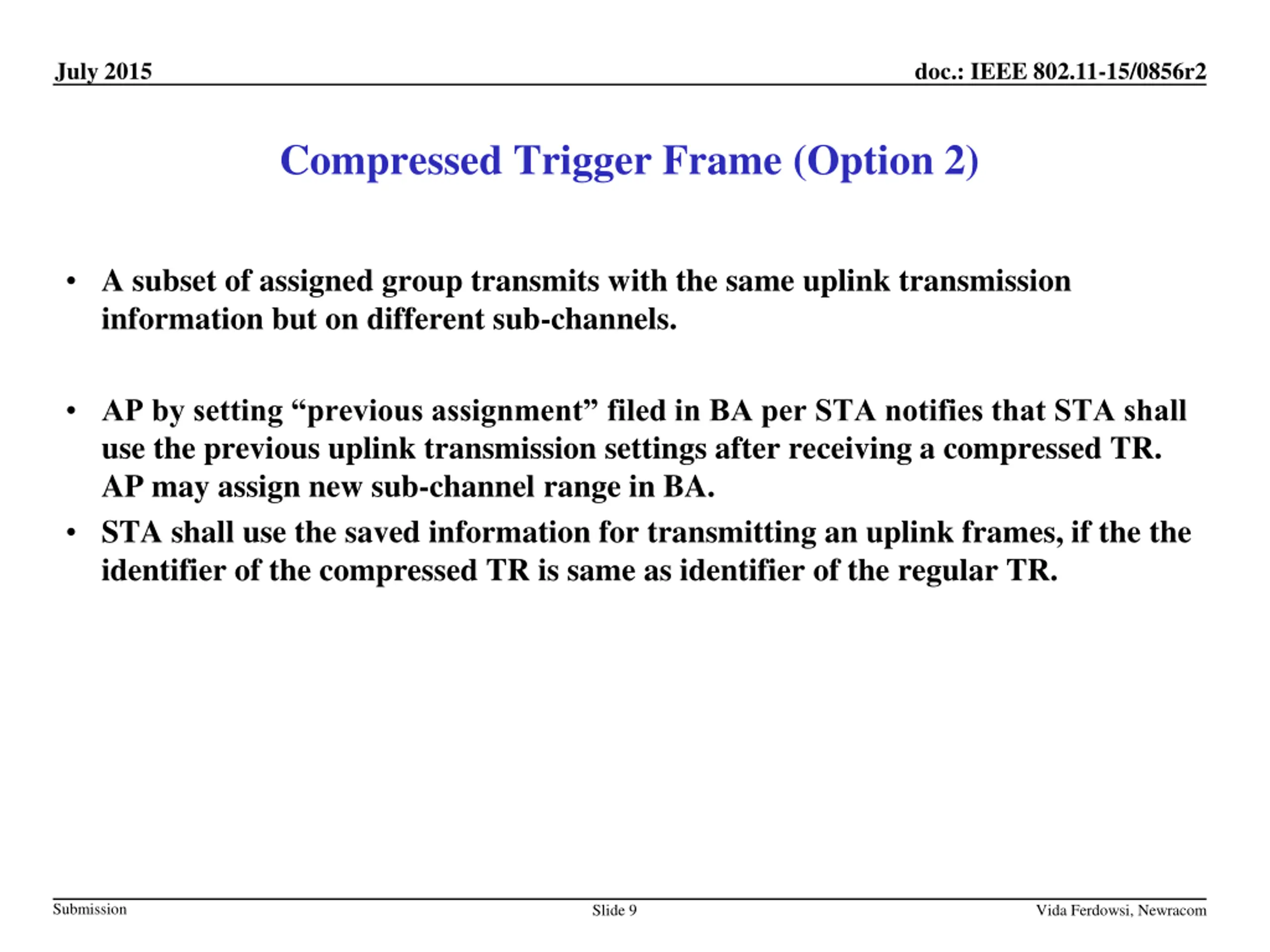 July 2015 doc.: IEEE 802.11-15/0856r2 Compressed Trigger Frame (option 1) Same resource allocation is repeated for the same group of STAs. If More elements field has NOT been set, it means the trigger frame dose NOT contain resource allocation elements. STA shall save the information of TRs per TXOP. If the identifier of compressed TR is same as the identifier of the saved TR, then STA shall use the saved information for uplink transmission. Submission Slide 8 Vida Ferdowsi, Newracom