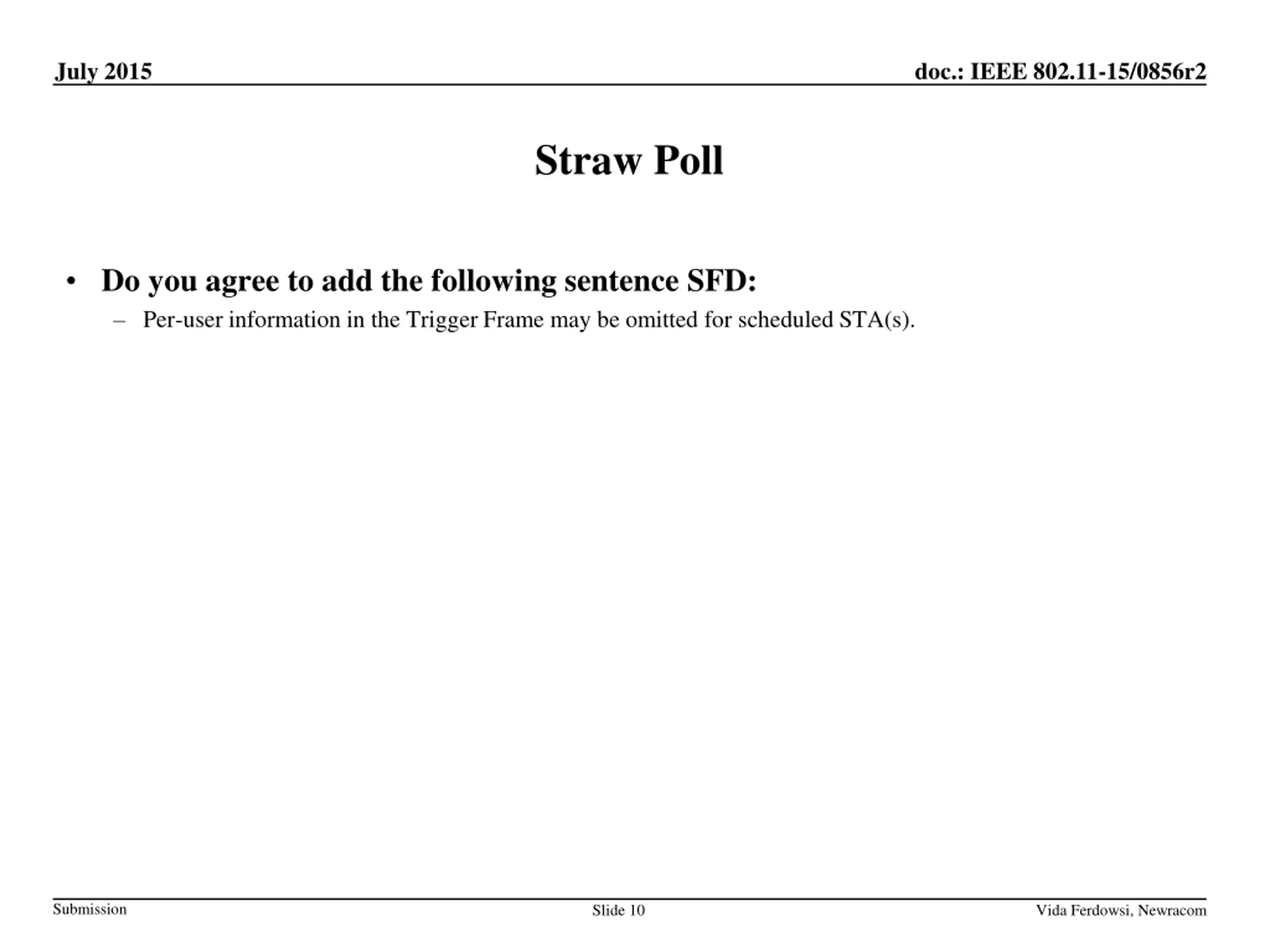 July 2015 doc.: IEEE 802.11-15/0856r2 Straw Poll Do you agree to add the following sentence SFD: Per-user information in the Trigger Frame may be omitted for scheduled STA(s). Submission Slide 10 Vida Ferdowsi, Newracom