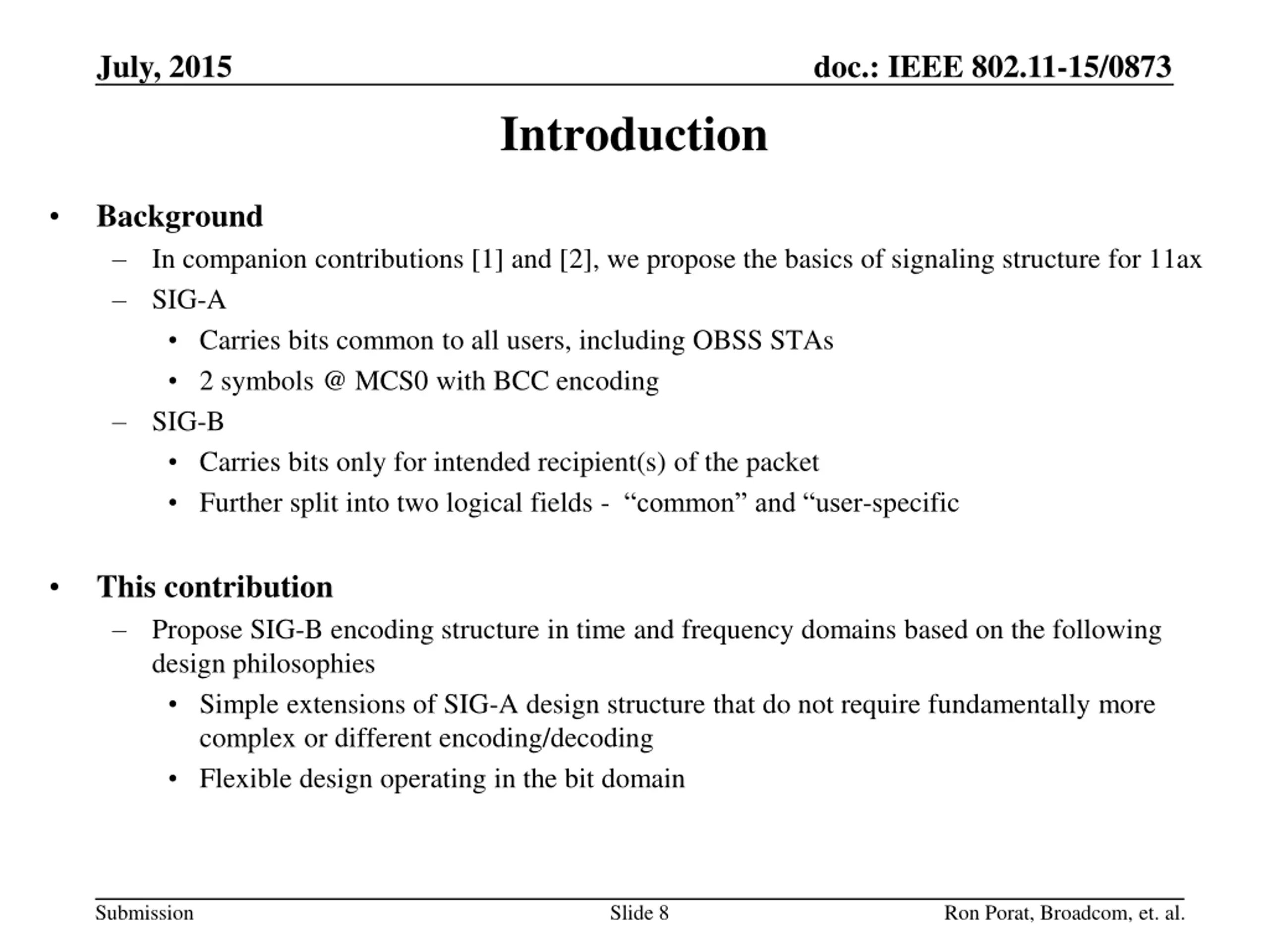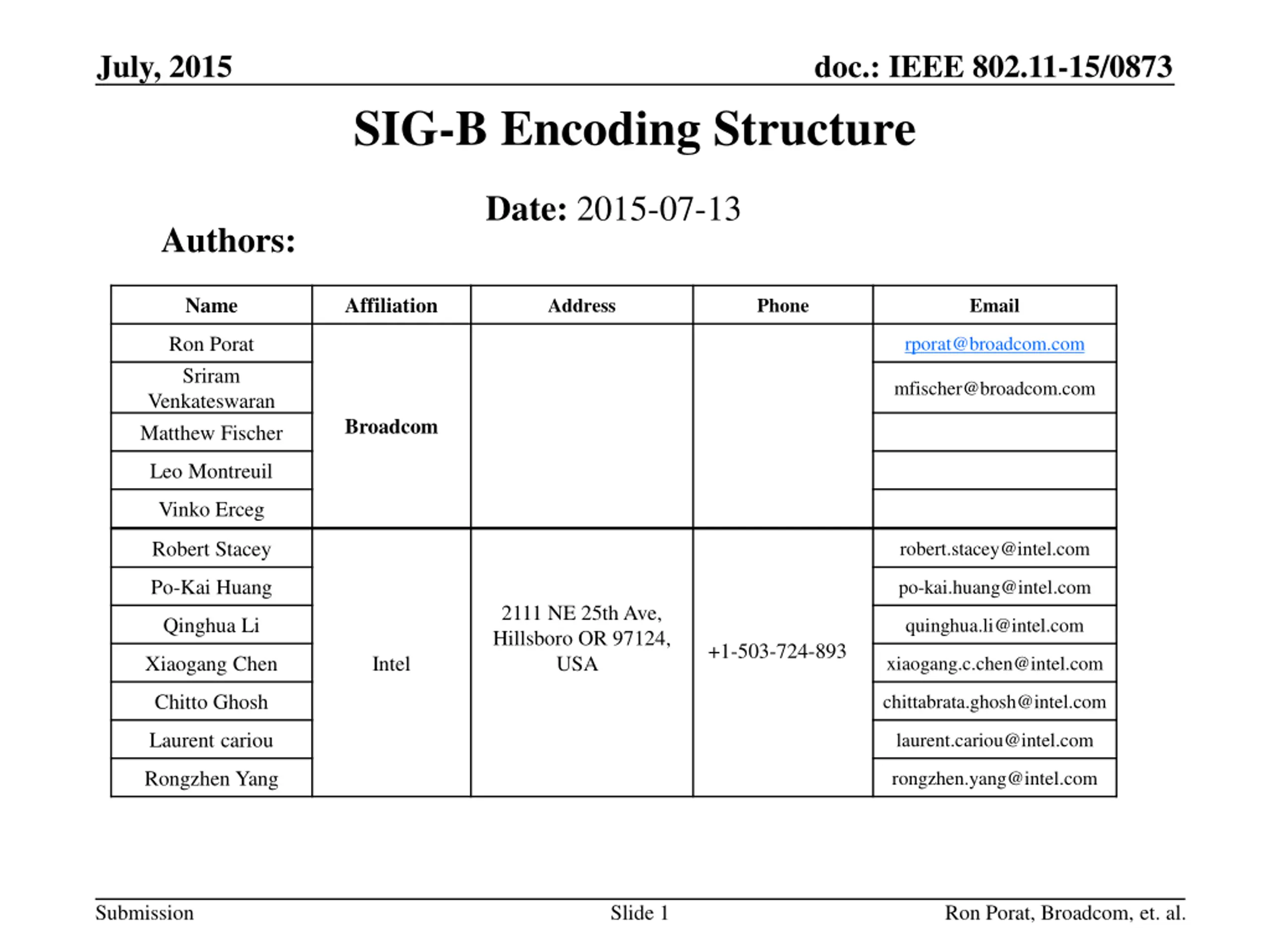 July, 2015 doc.: IEEE 802.11-15/0873 SIG-B Encoding Structure Date: 2015-07-13 Authors: Name Affiliation Address Phone Email Ron Porat Sriram Venkateswaran Matthew Fischer rporat@broadcom.com mfischer@broadcom.com Broadcom Leo Montreuil Vinko Erceg Robert Stacey robert.stacey@intel.com Po-Kai Huang po-kai.huang@intel.com 2111 NE 25th Ave, Hillsboro OR 97124, USA Qinghua Li quinghua.li@intel.com +1-503-724-893 Xiaogang Chen Intel xiaogang.c.chen@intel.com Chitto Ghosh chittabrata.ghosh@intel.com Laurent cariou laurent.cariou@intel.com Rongzhen Yang rongzhen.yang@intel.com Submission Slide 1 Ron Porat, Broadcom, et. al.
