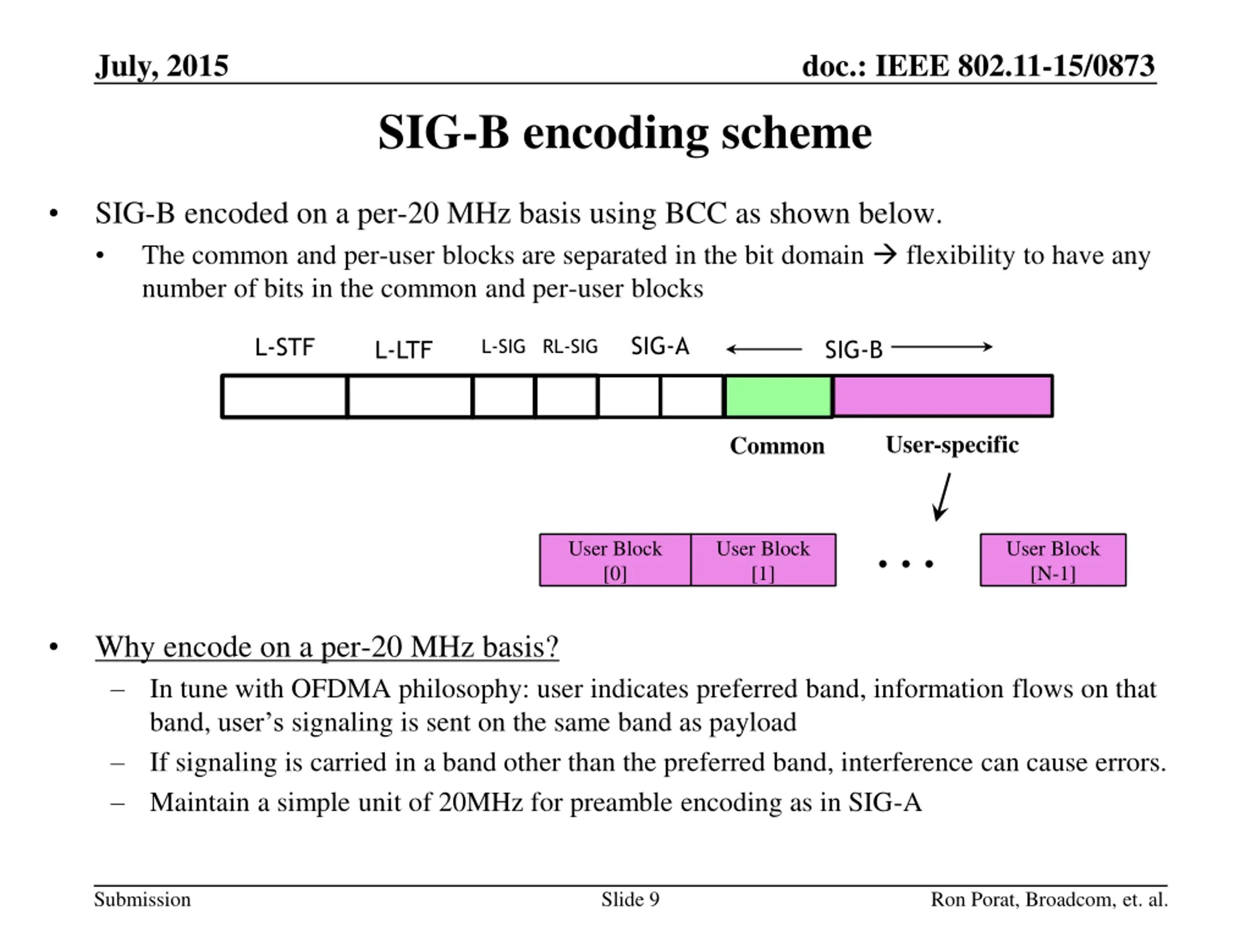 July, 2015 doc.: IEEE 802.11-15/0873 Introduction Background In companion contributions [1] and [2], we propose the basics of signaling structure for 11ax SIG-A Carries bits common to all users, including OBSS STAs 2 symbols @ MCS0 with BCC encoding SIG-B Carries bits only for intended recipient(s) of the packet Further split into two logical fields - common and user-specific This contribution Propose SIG-B encoding structure in time and frequency domains based on the following design philosophies Simple extensions of SIG-A design structure that do not require fundamentally more complex or different encoding/decoding Flexible design operating in the bit domain Submission Slide 8 Ron Porat, Broadcom, et. al.