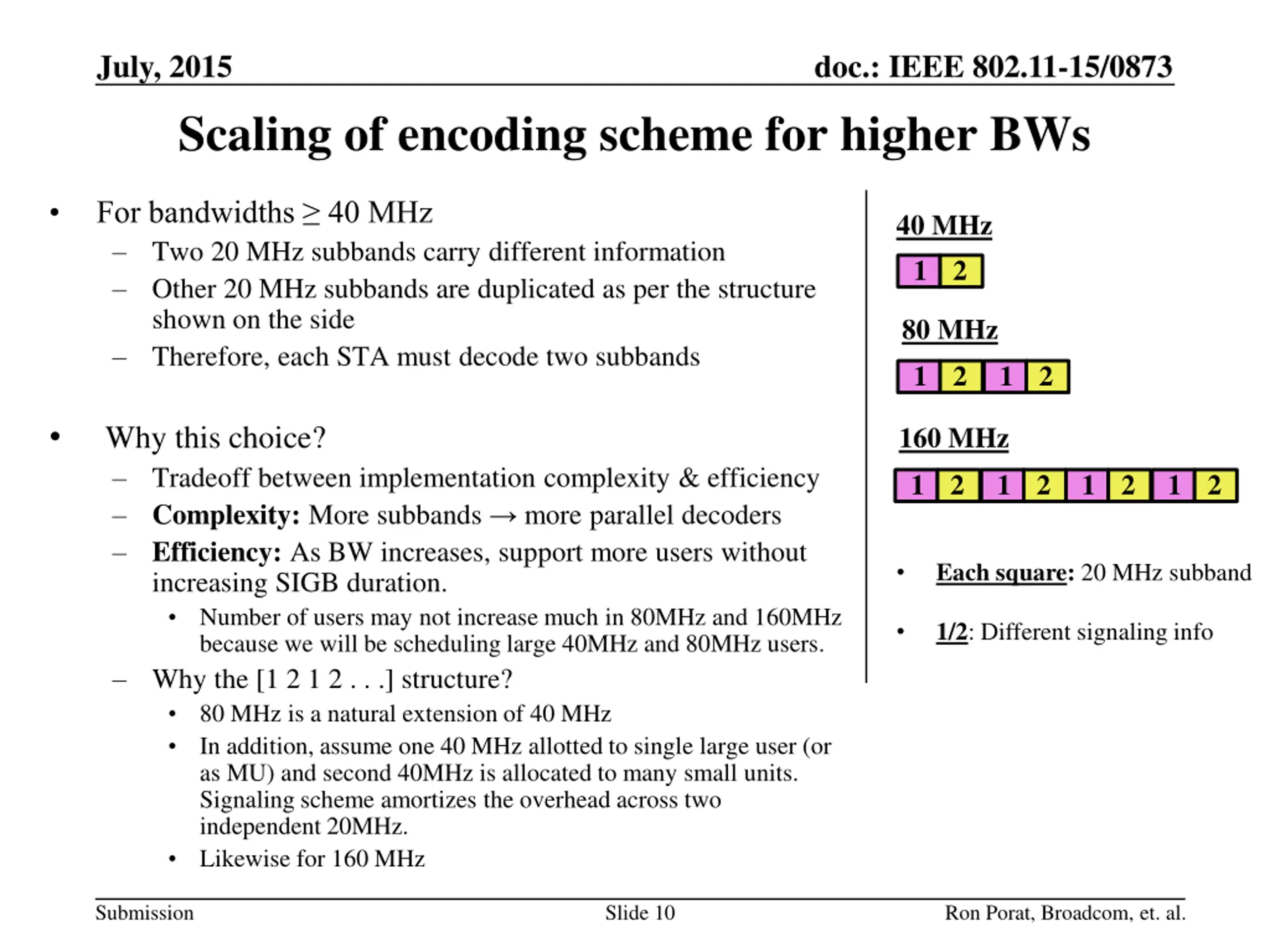 July, 2015 doc.: IEEE 802.11-15/0873 SIG-B encoding scheme SIG-B encoded on a per-20 MHz basis using BCC as shown below. The common and per-user blocks are separated in the bit domain flexibility to have any number of bits in the common and per-user blocks SIG-A L-STF RL-SIG L-SIG SIG-B L-LTF User-specific Common User Block [0] User Block [1] User Block [N-1] Why encode on a per-20 MHz basis? In tune with OFDMA philosophy: user indicates preferred band, information flows on that band, user s signaling is sent on the same band as payload If signaling is carried in a band other than the preferred band, interference can cause errors. Maintain a simple unit of 20MHz for preamble encoding as in SIG-A Submission Slide 9 Ron Porat, Broadcom, et. al.