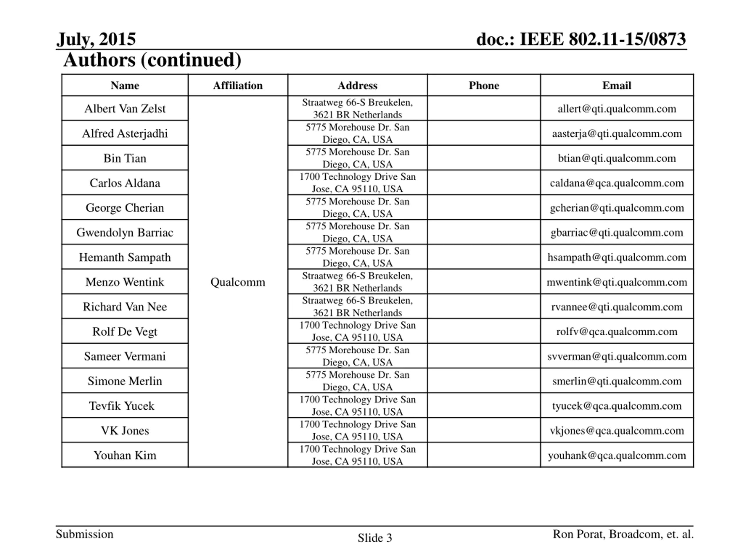 July, 2015 Authors (continued) doc.: IEEE 802.11-15/0873 Name Affiliation Address Phone Email Straatweg 66-S Breukelen, 3621 BR Netherlands 5775 Morehouse Dr. San Diego, CA, USA 5775 Morehouse Dr. San Diego, CA, USA 1700 Technology Drive San Jose, CA 95110, USA 5775 Morehouse Dr. San Diego, CA, USA 5775 Morehouse Dr. San Diego, CA, USA 5775 Morehouse Dr. San Diego, CA, USA Straatweg 66-S Breukelen, 3621 BR Netherlands Straatweg 66-S Breukelen, 3621 BR Netherlands 1700 Technology Drive San Jose, CA 95110, USA 5775 Morehouse Dr. San Diego, CA, USA 5775 Morehouse Dr. San Diego, CA, USA 1700 Technology Drive San Jose, CA 95110, USA 1700 Technology Drive San Jose, CA 95110, USA 1700 Technology Drive San Jose, CA 95110, USA Albert Van Zelst allert@qti.qualcomm.com Alfred Asterjadhi aasterja@qti.qualcomm.com Bin Tian btian@qti.qualcomm.com Carlos Aldana caldana@qca.qualcomm.com George Cherian gcherian@qti.qualcomm.com Gwendolyn Barriac gbarriac@qti.qualcomm.com Hemanth Sampath hsampath@qti.qualcomm.com Menzo Wentink Qualcomm mwentink@qti.qualcomm.com Richard Van Nee rvannee@qti.qualcomm.com Rolf De Vegt rolfv@qca.qualcomm.com Sameer Vermani svverman@qti.qualcomm.com Simone Merlin smerlin@qti.qualcomm.com Tevfik Yucek tyucek@qca.qualcomm.com VK Jones vkjones@qca.qualcomm.com Youhan Kim youhank@qca.qualcomm.com Submission Ron Porat, Broadcom, et. al. Slide 3