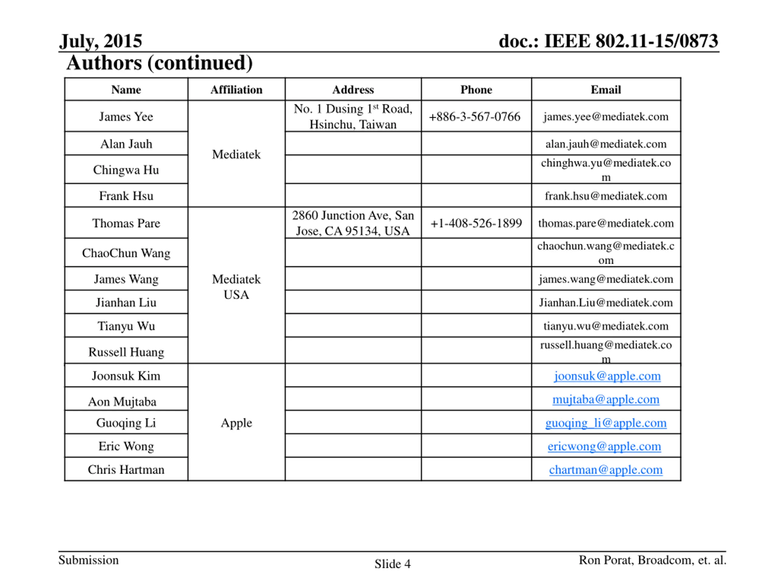 July, 2015 Authors (continued) doc.: IEEE 802.11-15/0873 Name Affiliation Address Phone Email No. 1 Dusing 1st Road, Hsinchu, Taiwan James Yee +886-3-567-0766 james.yee@mediatek.com Alan Jauh alan.jauh@mediatek.com chinghwa.yu@mediatek.co m frank.hsu@mediatek.com Mediatek Chingwa Hu Frank Hsu 2860 Junction Ave, San Jose, CA 95134, USA Thomas Pare +1-408-526-1899 thomas.pare@mediatek.com chaochun.wang@mediatek.c om james.wang@mediatek.com ChaoChun Wang James Wang Mediatek USA Jianhan Liu Jianhan.Liu@mediatek.com Tianyu Wu tianyu.wu@mediatek.com russell.huang@mediatek.co m joonsuk@apple.com Russell Huang Joonsuk Kim mujtaba@apple.com Aon Mujtaba Guoqing Li Apple guoqing_li@apple.com Eric Wong ericwong@apple.com Chris Hartman chartman@apple.com Submission Ron Porat, Broadcom, et. al. Slide 4