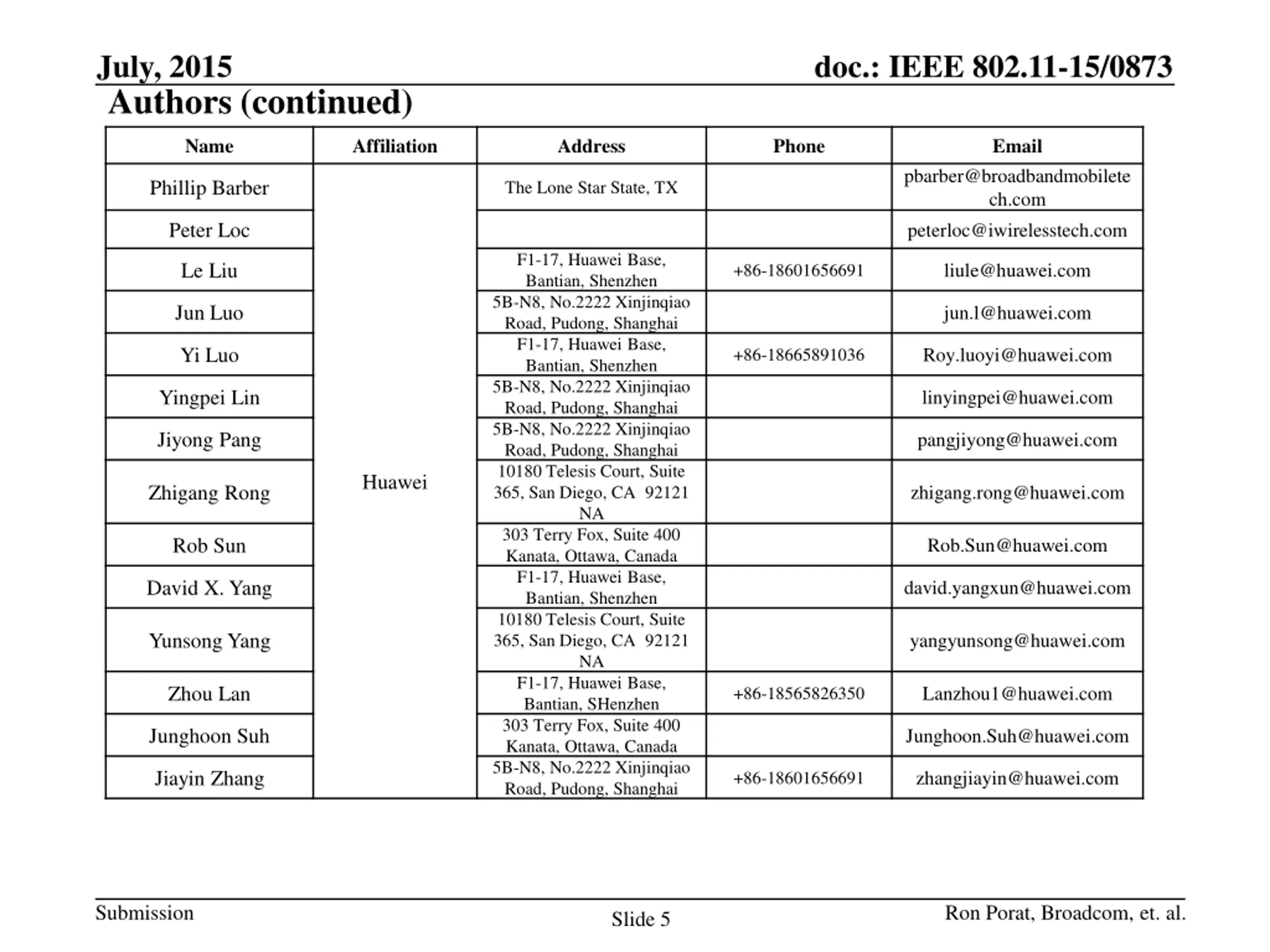 July, 2015 Authors (continued) doc.: IEEE 802.11-15/0873 Name Affiliation Address Phone Email pbarber@broadbandmobilete ch.com peterloc@iwirelesstech.com Phillip Barber The Lone Star State, TX Peter Loc F1-17, Huawei Base, Bantian, Shenzhen 5B-N8, No.2222 Xinjinqiao Road, Pudong, Shanghai F1-17, Huawei Base, Bantian, Shenzhen 5B-N8, No.2222 Xinjinqiao Road, Pudong, Shanghai 5B-N8, No.2222 Xinjinqiao Road, Pudong, Shanghai 10180 Telesis Court, Suite 365, San Diego, CA 92121 NA 303 Terry Fox, Suite 400 Kanata, Ottawa, Canada F1-17, Huawei Base, Bantian, Shenzhen 10180 Telesis Court, Suite 365, San Diego, CA 92121 NA F1-17, Huawei Base, Bantian, SHenzhen 303 Terry Fox, Suite 400 Kanata, Ottawa, Canada 5B-N8, No.2222 Xinjinqiao Road, Pudong, Shanghai Le Liu liule@huawei.com +86-18601656691 Jun Luo jun.l@huawei.com Yi Luo Roy.luoyi@huawei.com +86-18665891036 Yingpei Lin linyingpei@huawei.com Jiyong Pang pangjiyong@huawei.com Huawei Zhigang Rong zhigang.rong@huawei.com Rob Sun Rob.Sun@huawei.com David X. Yang david.yangxun@huawei.com Yunsong Yang yangyunsong@huawei.com Zhou Lan Lanzhou1@huawei.com +86-18565826350 Junghoon Suh Junghoon.Suh@huawei.com Jiayin Zhang zhangjiayin@huawei.com +86-18601656691 Submission Ron Porat, Broadcom, et. al. Slide 5
