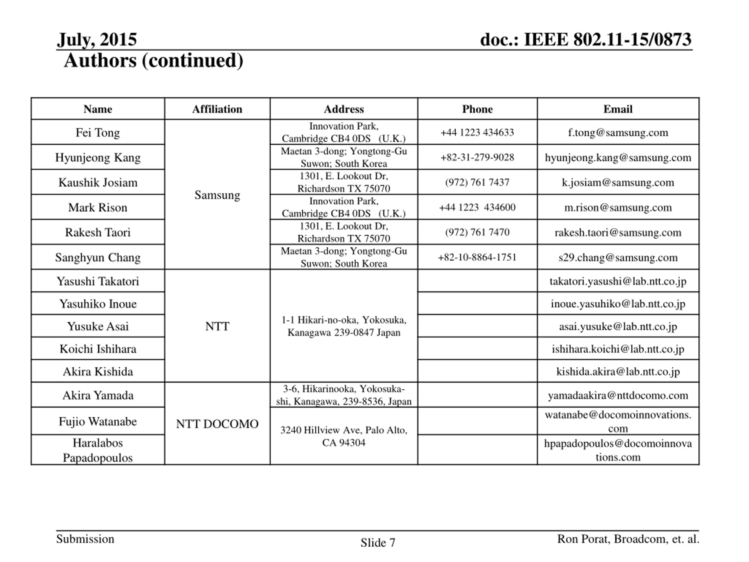 July, 2015 Authors (continued) doc.: IEEE 802.11-15/0873 Name Affiliation Address Innovation Park, Cambridge CB4 0DS (U.K.) Maetan 3-dong; Yongtong-Gu Suwon; South Korea 1301, E. Lookout Dr, Richardson TX 75070 Innovation Park, Cambridge CB4 0DS (U.K.) 1301, E. Lookout Dr, Richardson TX 75070 Maetan 3-dong; Yongtong-Gu Suwon; South Korea Phone Email Fei Tong f.tong@samsung.com +44 1223 434633 Hyunjeong Kang hyunjeong.kang@samsung.com +82-31-279-9028 Kaushik Josiam k.josiam@samsung.com (972) 761 7437 Samsung Mark Rison m.rison@samsung.com +44 1223 434600 Rakesh Taori rakesh.taori@samsung.com (972) 761 7470 Sanghyun Chang s29.chang@samsung.com +82-10-8864-1751 Yasushi Takatori takatori.yasushi@lab.ntt.co.jp Yasuhiko Inoue inoue.yasuhiko@lab.ntt.co.jp 1-1 Hikari-no-oka, Yokosuka, Kanagawa 239-0847 Japan Yusuke Asai NTT asai.yusuke@lab.ntt.co.jp Koichi Ishihara ishihara.koichi@lab.ntt.co.jp Akira Kishida kishida.akira@lab.ntt.co.jp 3-6, Hikarinooka, Yokosuka- shi, Kanagawa, 239-8536, Japan Akira Yamada yamadaakira@nttdocomo.com watanabe@docomoinnovations. com hpapadopoulos@docomoinnova tions.com Fujio Watanabe NTT DOCOMO 3240 Hillview Ave, Palo Alto, CA 94304 Haralabos Papadopoulos Submission Ron Porat, Broadcom, et. al. Slide 7
