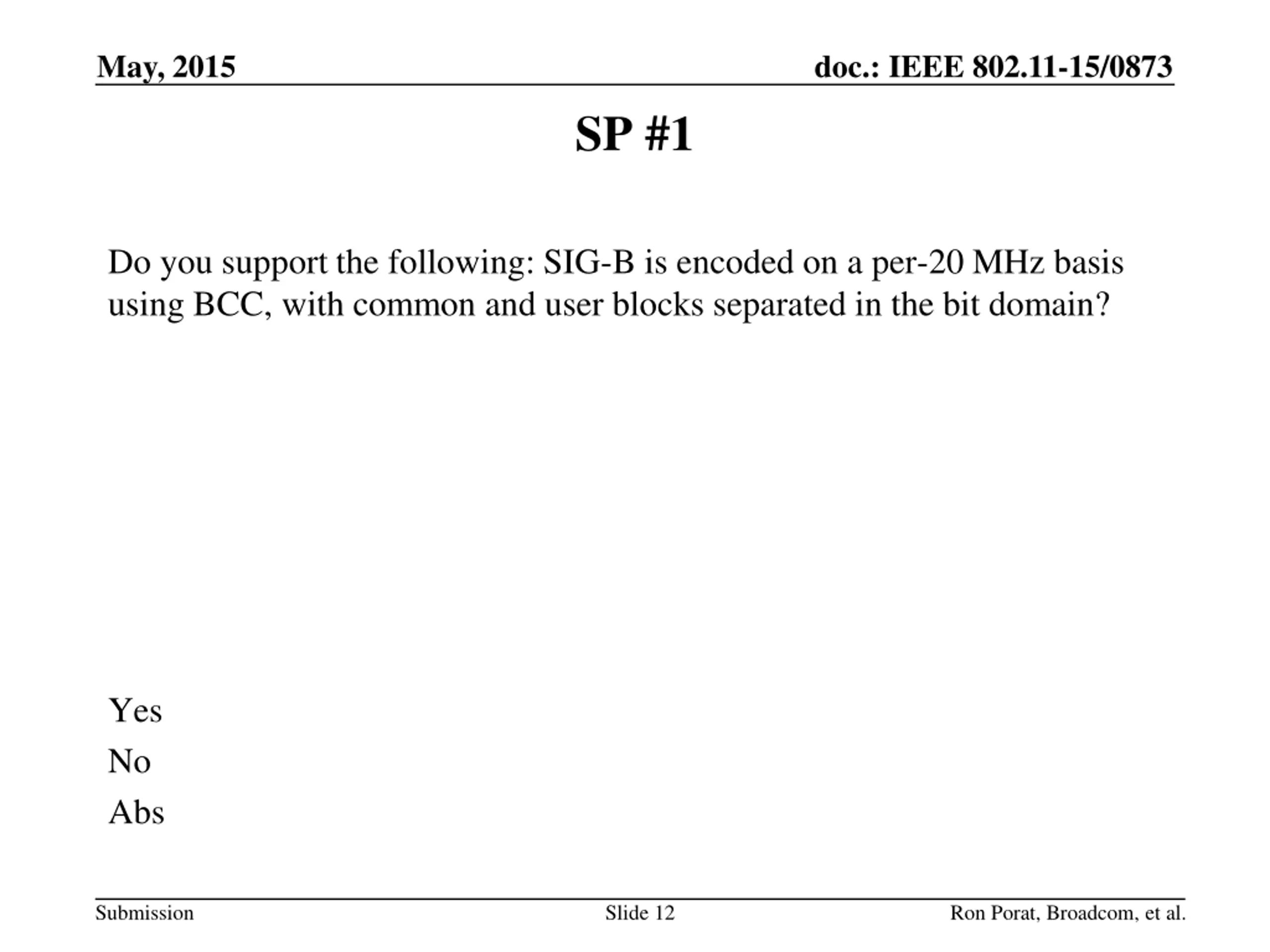 May, 2015 doc.: IEEE 802.11-15/0873 SP #1 Do you support the following: SIG-B is encoded on a per-20 MHz basis using BCC, with common and user blocks separated in the bit domain? Yes No Abs Submission Slide 12 Ron Porat, Broadcom, et al.
