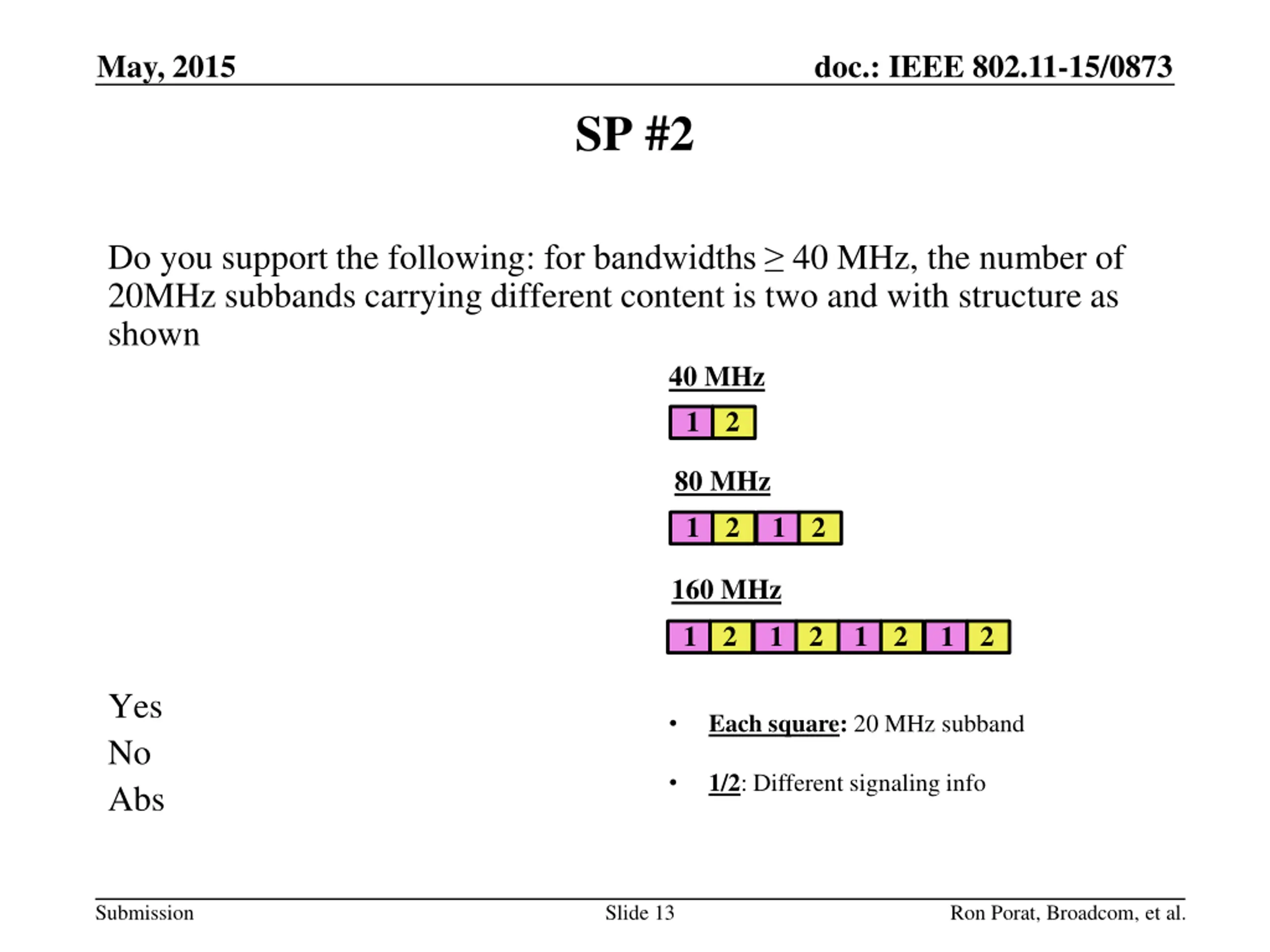 May, 2015 doc.: IEEE 802.11-15/0873 SP #2 Do you support the following: for bandwidths 40 MHz, the number of 20MHz subbands carrying different content is two and with structure as shown 40 MHz 1 2 80 MHz 1 2 1 2 160 MHz 1 2 1 2 1 2 1 2 Yes No Abs Each square: 20 MHz subband 1/2: Different signaling info Submission Slide 13 Ron Porat, Broadcom, et al.