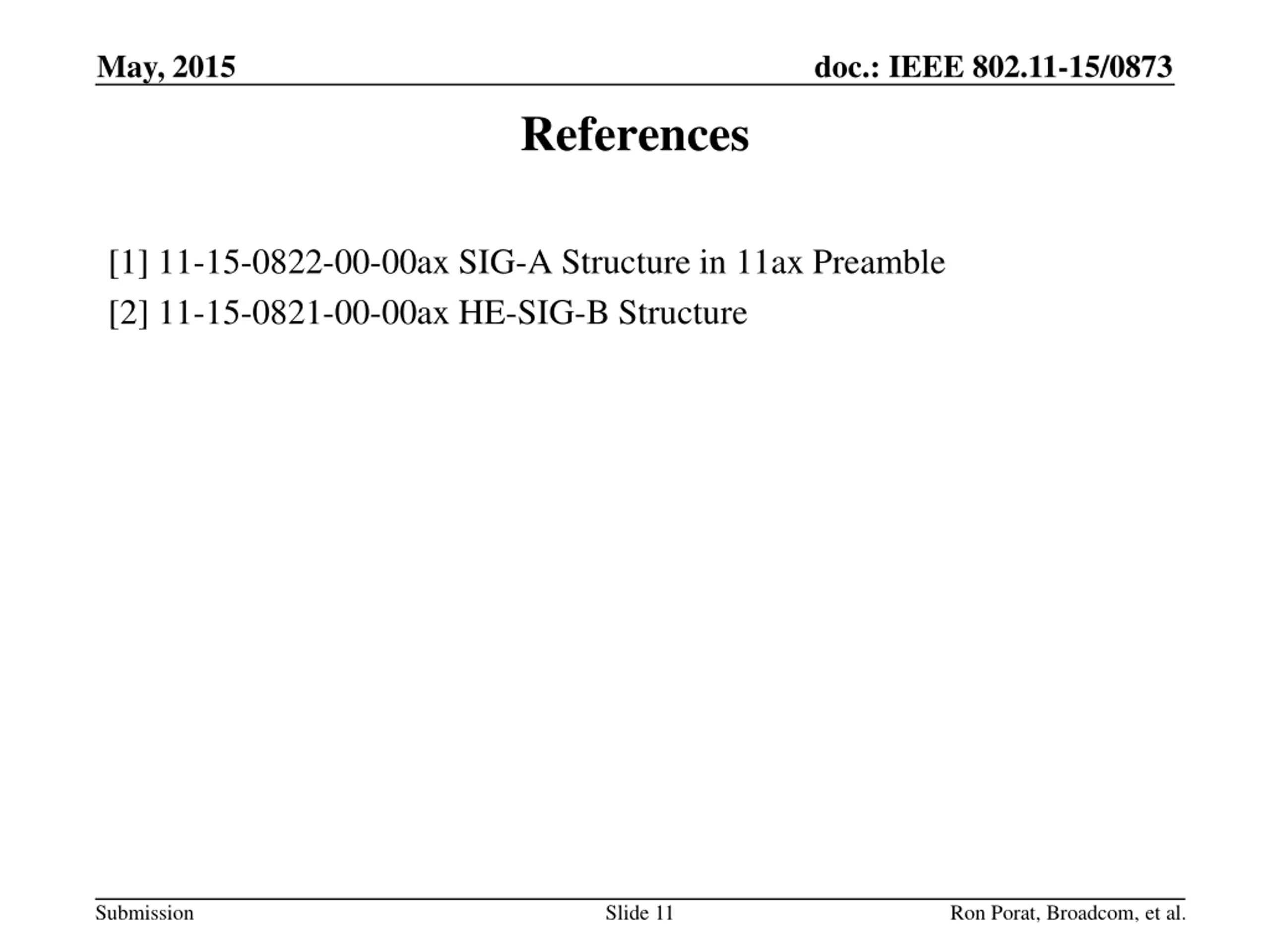 May, 2015 doc.: IEEE 802.11-15/0873 References [1] 11-15-0822-00-00ax SIG-A Structure in 11ax Preamble [2] 11-15-0821-00-00ax HE-SIG-B Structure Submission Slide 11 Ron Porat, Broadcom, et al.