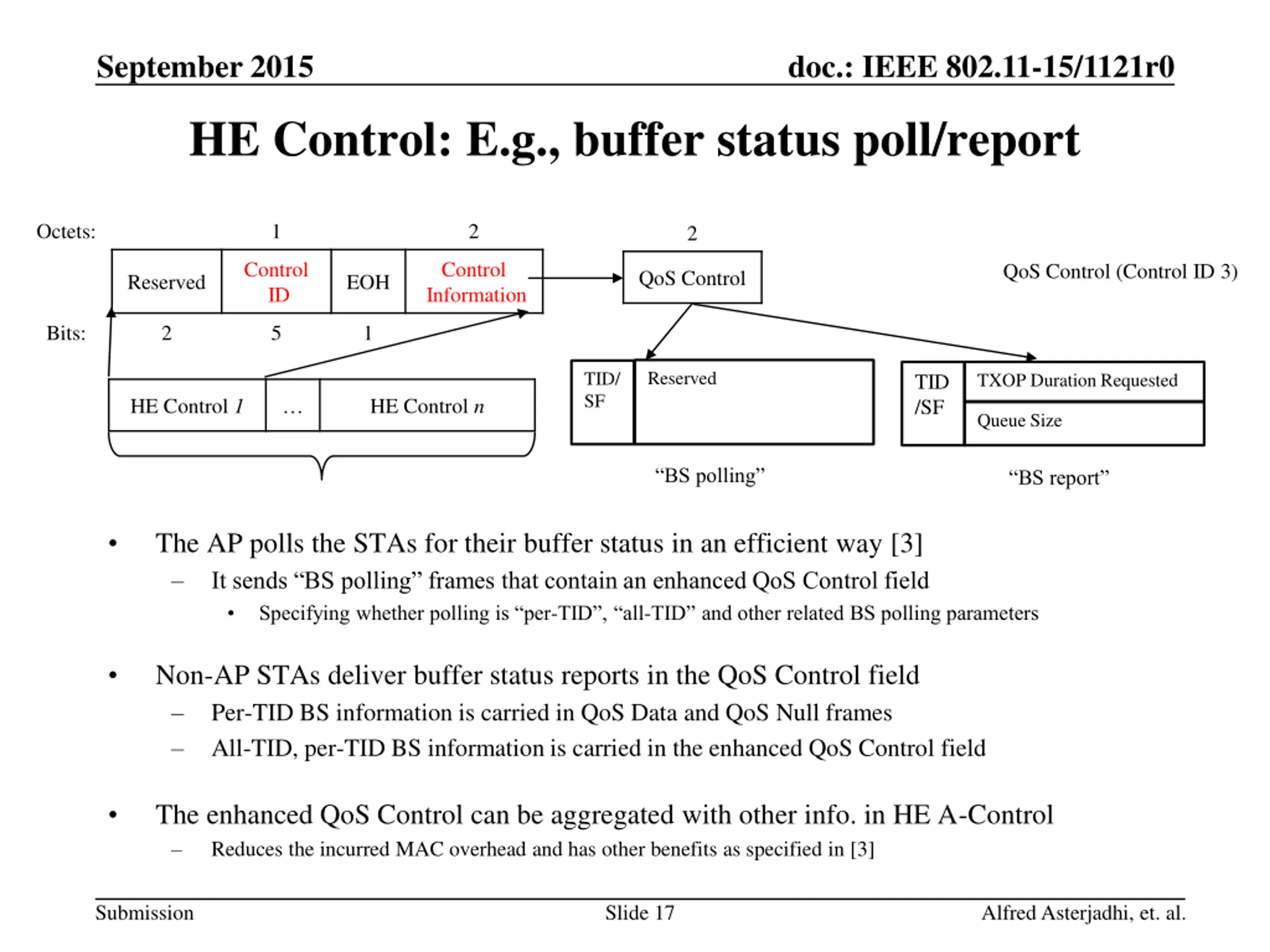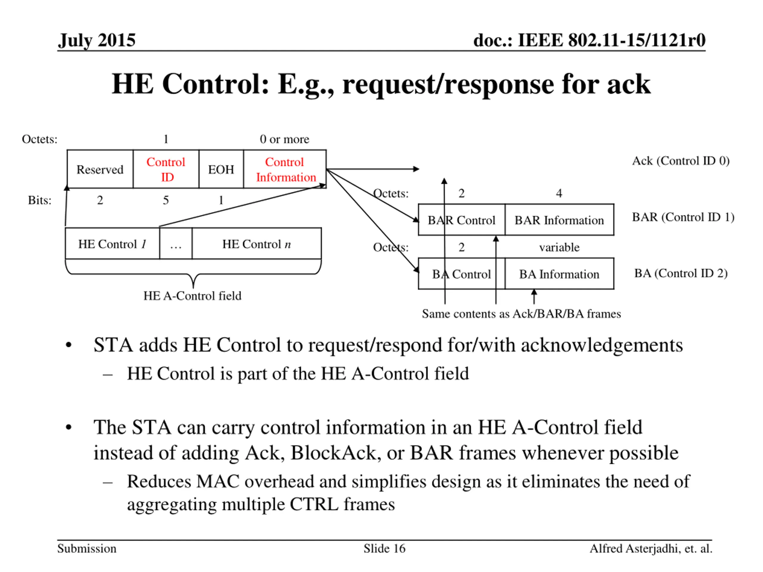 July 2015 doc.: IEEE 802.11-15/1121r0 HE Control: E.g., request/response for ack Octets: 1 0 or more Ack (Control ID 0) Control ID Control Information Reserved EOH Octets: 2 4 Bits: 2 5 1 BAR (Control ID 1) BAR Control BAR Information HE Control 1 HE Control n Octets: 2 variable BA (Control ID 2) BA Control BA Information HE A-Control field Same contents as Ack/BAR/BA frames STA adds HE Control to request/respond for/with acknowledgements HE Control is part of the HE A-Control field The STA can carry control information in an HE A-Control field instead of adding Ack, BlockAck, or BAR frames whenever possible Reduces MAC overhead and simplifies design as it eliminates the need of aggregating multiple CTRL frames Submission Slide 16 Alfred Asterjadhi, et. al.