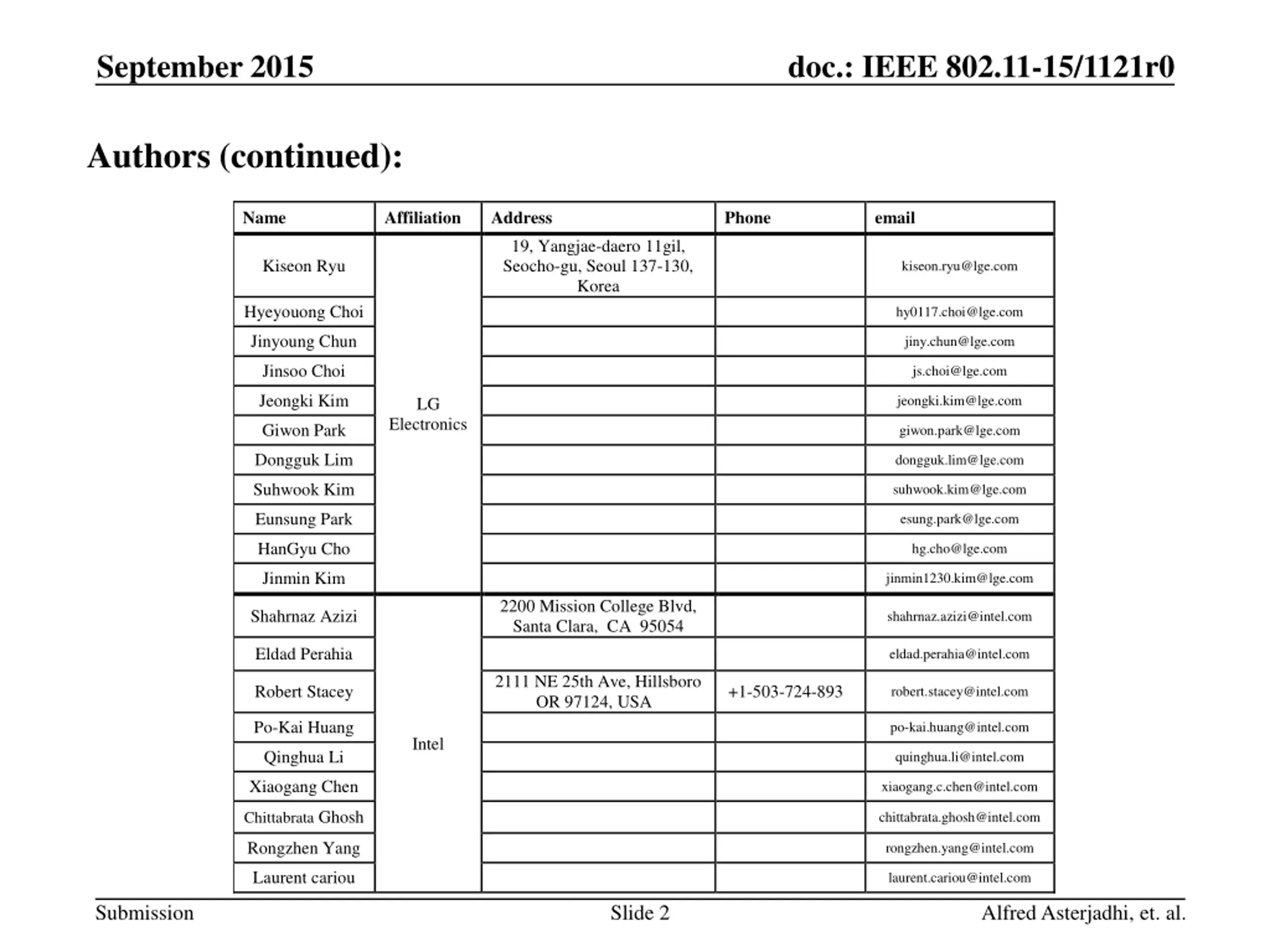 September 2015 doc.: IEEE 802.11-15/1121r0 Authors (continued): Name Affiliation Address 19, Yangjae-daero 11gil, Seocho-gu, Seoul 137-130, Korea Phone email Kiseon Ryu kiseon.ryu@lge.com Hyeyouong Choi hy0117.choi@lge.com Jinyoung Chun jiny.chun@lge.com Jinsoo Choi js.choi@lge.com Jeongki Kim jeongki.kim@lge.com LG Electronics Giwon Park giwon.park@lge.com Dongguk Lim dongguk.lim@lge.com Suhwook Kim suhwook.kim@lge.com Eunsung Park esung.park@lge.com HanGyu Cho hg.cho@lge.com Jinmin Kim jinmin1230.kim@lge.com 2200 Mission College Blvd, Santa Clara, CA 95054 2111 NE 25th Ave, Hillsboro OR 97124, USA Shahrnaz Azizi shahrnaz.azizi@intel.com Eldad Perahia eldad.perahia@intel.com Robert Stacey +1-503-724-893 robert.stacey@intel.com Po-Kai Huang po-kai.huang@intel.com Intel Qinghua Li quinghua.li@intel.com Xiaogang Chen xiaogang.c.chen@intel.com Chittabrata Ghosh chittabrata.ghosh@intel.com Rongzhen Yang rongzhen.yang@intel.com Laurent cariou laurent.cariou@intel.com 1 Submission Slide 2 Alfred Asterjadhi, et. al.