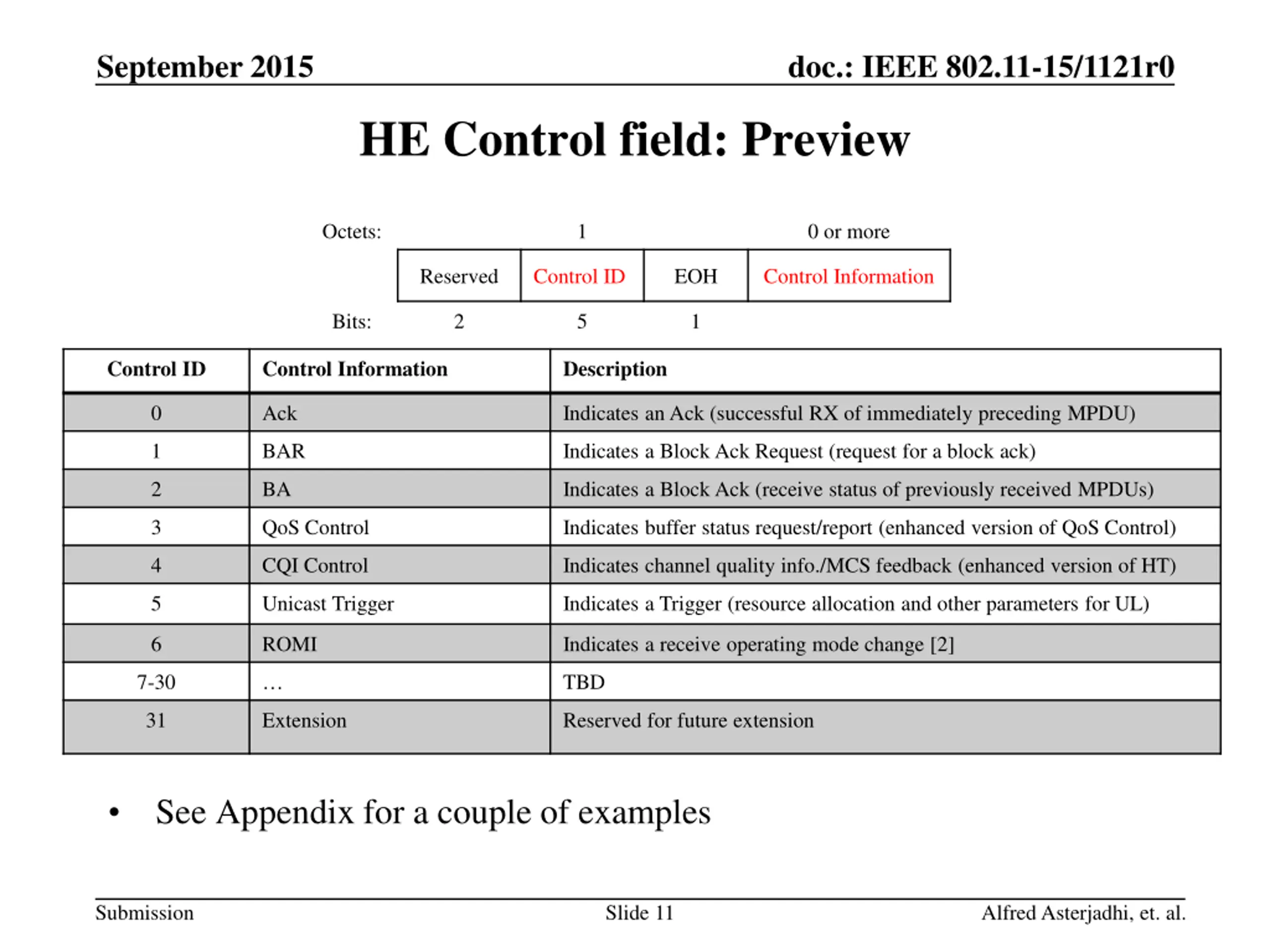 September 2015 doc.: IEEE 802.11-15/1121r0 HE A-Control field as HT Control variant 2 2 6 6 6 2 0/6 0/2 0/4 0/8 variable 0/8 4 Duration /ID QoS Ctrl HT Ctrl CCMP Header Frame Body FC A1 A2 A3 SC A4 MIC FCS variable B1 B2 B6 B7 B0 VHT (1) HE (1) Control ID EOH (0) Ctrl. Info. Reserved value indicates HE A-Control variant of HT Control field HE A-Control field HE A-Control field added to QoS Data/Mgmt frames (variant of HT Control field) Currently the type of the HT Control field is determined by values of B0 and B1 B0 of HT Control field differentiates the VHT variant from the basic HT Control field (11n/11ac) If B0 and B1 are 1 then the HT Control field contains an HE A-Control field variant (11ax) Control ID field identifies the control information (usable for future amendments as well) End of HE Control (EOH) subfield in an HE Control indicates if another HE Control follows Contents of HT Control field across multiple MPDUs of an A-MPDU Currently it is the same for all HT Control fields generated by pre-11ax STAs (11n/11ac) Within HE PPDUs we may want to consider relaxing this restriction: A large variety of control information can be carried within the A-MPDU Increases robustness of info. by aggregating it in different parts of A-MPDU with minimal overhead Slide 10 Submission Alfred Asterjadhi, et. al.
