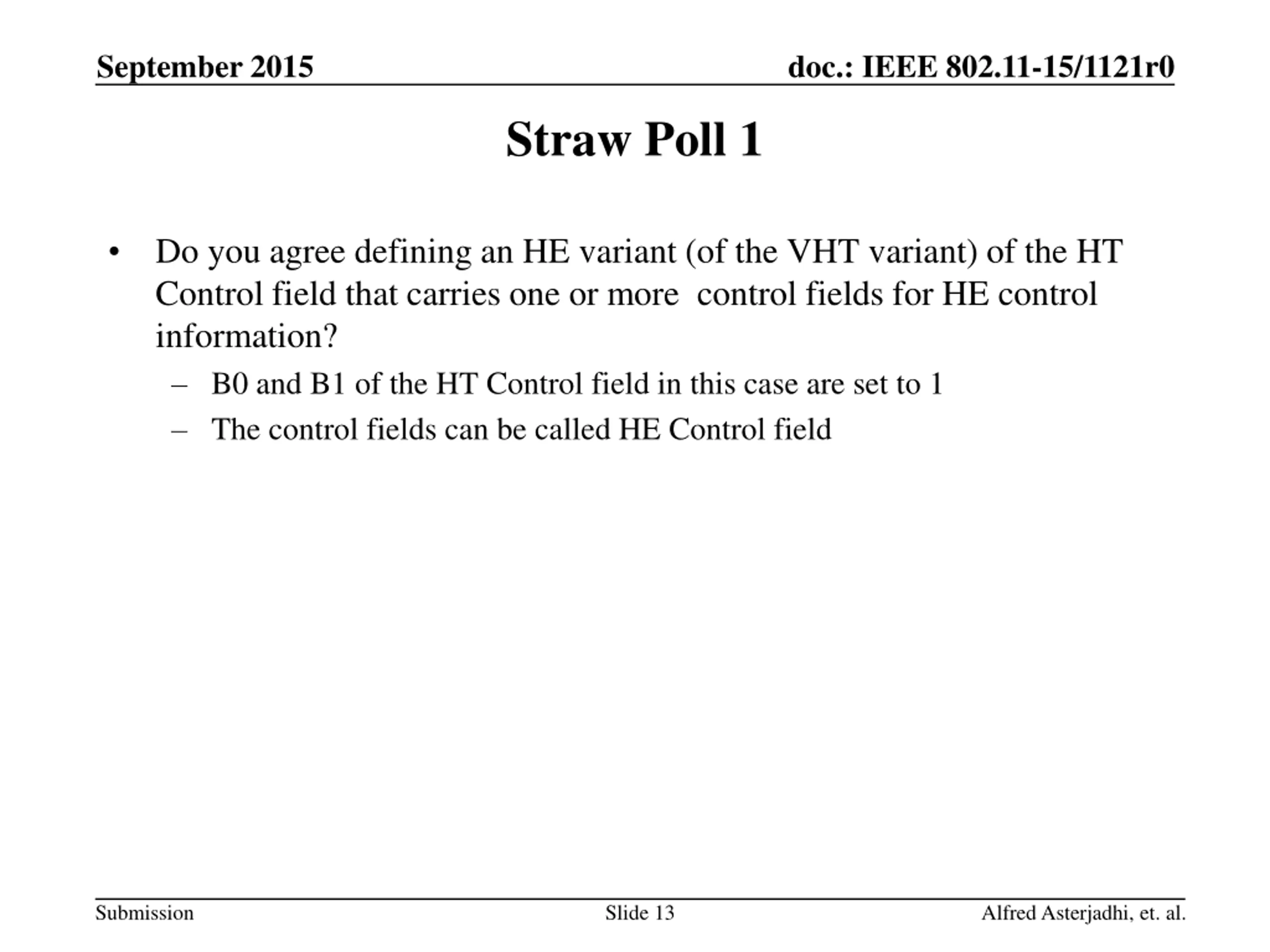 September 2015 doc.: IEEE 802.11-15/1121r0 Straw Poll 1 Do you agree defining an HE variant (of the VHT variant) of the HT Control field that carries one or more control fields for HE control information? B0 and B1 of the HT Control field in this case are set to 1 The control fields can be called HE Control field Submission Slide 13 Alfred Asterjadhi, et. al.