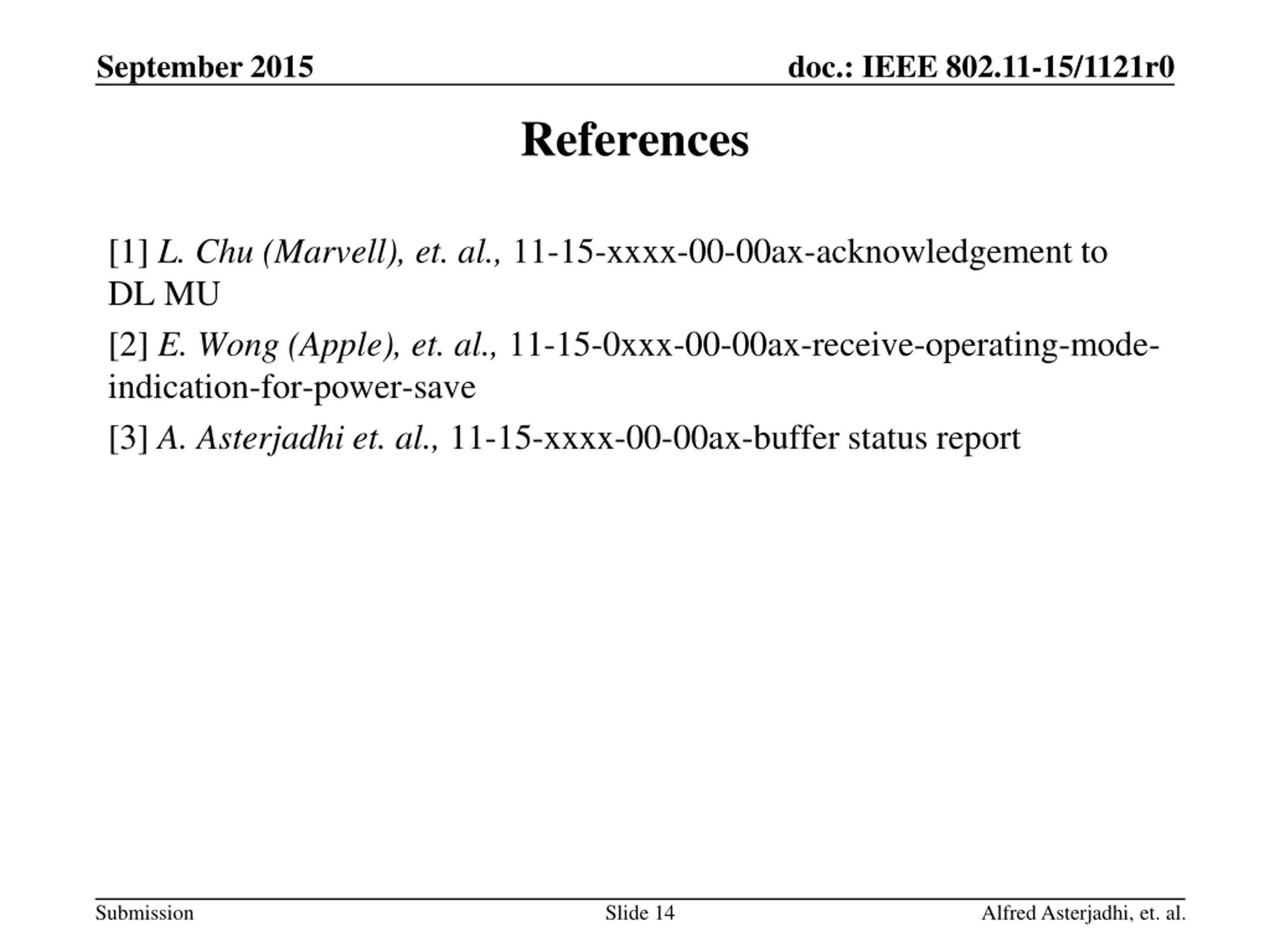 September 2015 doc.: IEEE 802.11-15/1121r0 References [1] L. Chu (Marvell), et. al., 11-15-xxxx-00-00ax-acknowledgement to DL MU [2] E. Wong (Apple), et. al., 11-15-0xxx-00-00ax-receive-operating-mode- indication-for-power-save [3] A. Asterjadhi et. al., 11-15-xxxx-00-00ax-buffer status report Submission Slide 14 Alfred Asterjadhi, et. al.
