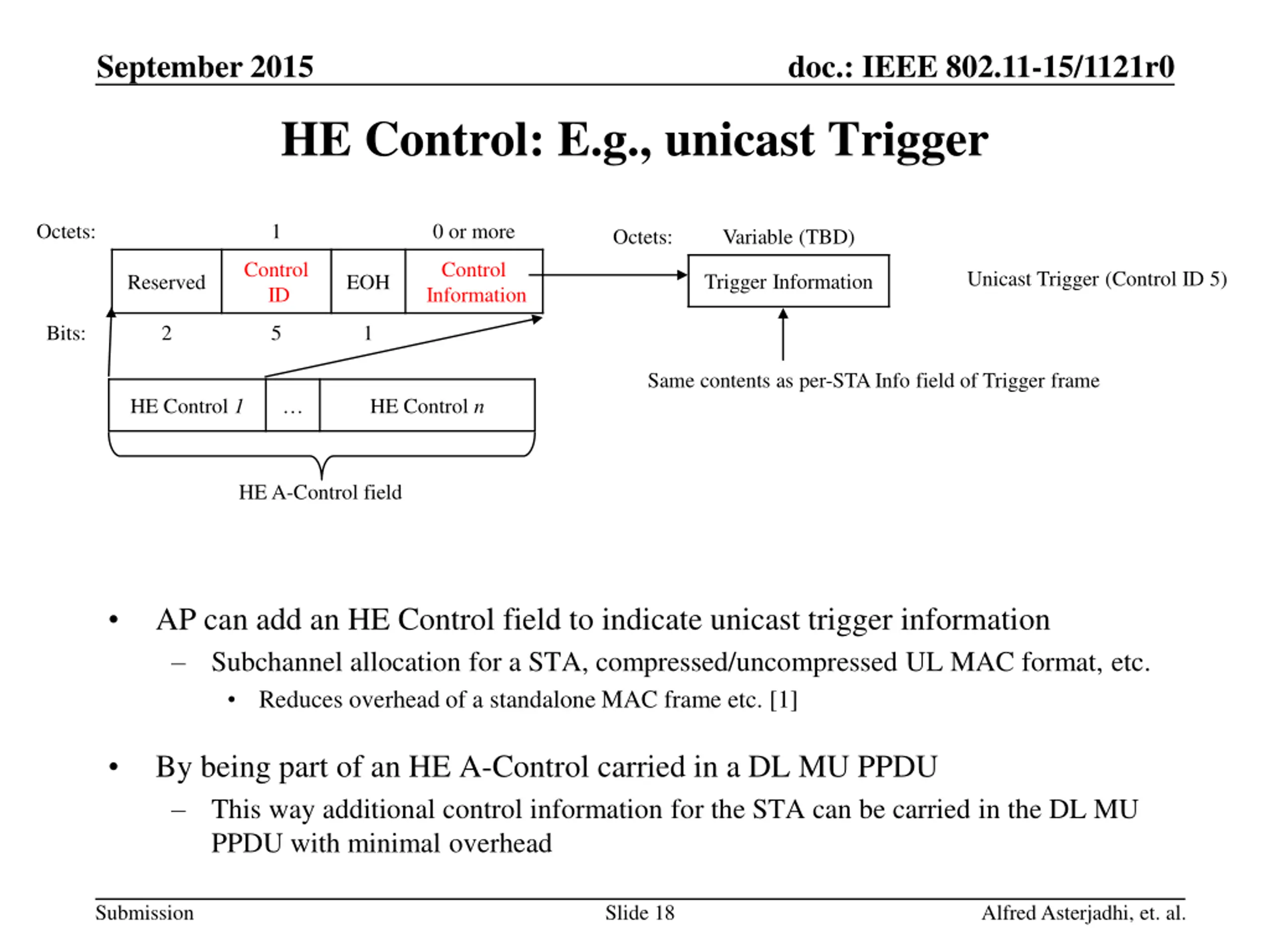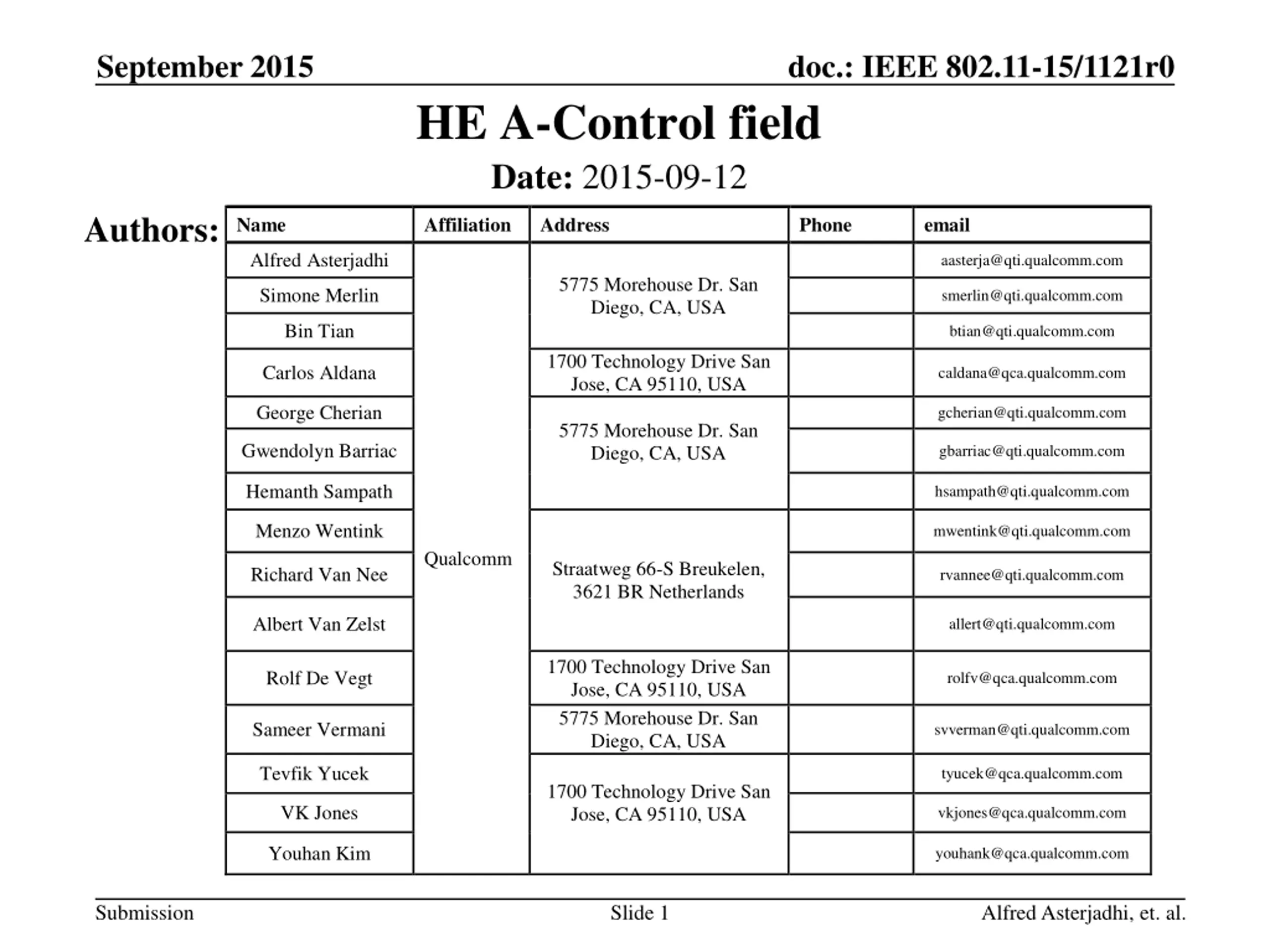 September 2015 doc.: IEEE 802.11-15/1121r0 HE A-Control field Date: 2015-09-12 Authors: Name Affiliation Address Phone email Alfred Asterjadhi aasterja@qti.qualcomm.com 5775 Morehouse Dr. San Diego, CA, USA Simone Merlin smerlin@qti.qualcomm.com Bin Tian btian@qti.qualcomm.com 1700 Technology Drive San Jose, CA 95110, USA Carlos Aldana caldana@qca.qualcomm.com George Cherian gcherian@qti.qualcomm.com 5775 Morehouse Dr. San Diego, CA, USA Gwendolyn Barriac gbarriac@qti.qualcomm.com Hemanth Sampath hsampath@qti.qualcomm.com Menzo Wentink mwentink@qti.qualcomm.com Qualcomm Straatweg 66-S Breukelen, 3621 BR Netherlands Richard Van Nee rvannee@qti.qualcomm.com Albert Van Zelst allert@qti.qualcomm.com 1700 Technology Drive San Jose, CA 95110, USA 5775 Morehouse Dr. San Diego, CA, USA Rolf De Vegt rolfv@qca.qualcomm.com Sameer Vermani svverman@qti.qualcomm.com Tevfik Yucek tyucek@qca.qualcomm.com 1700 Technology Drive San Jose, CA 95110, USA VK Jones vkjones@qca.qualcomm.com Youhan Kim youhank@qca.qualcomm.com 1 Submission Slide 1 Alfred Asterjadhi, et. al.