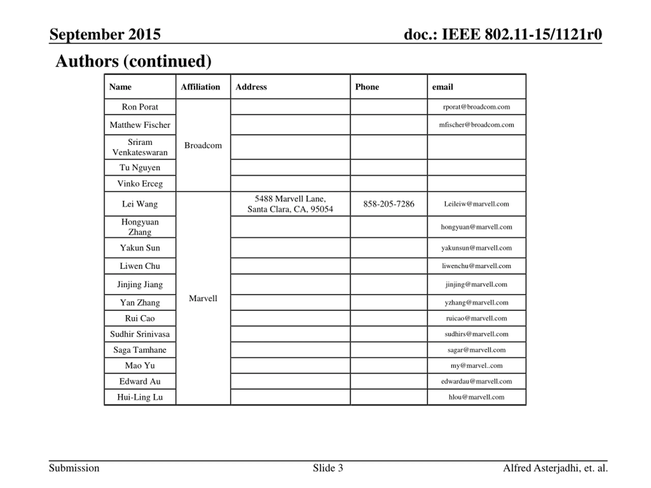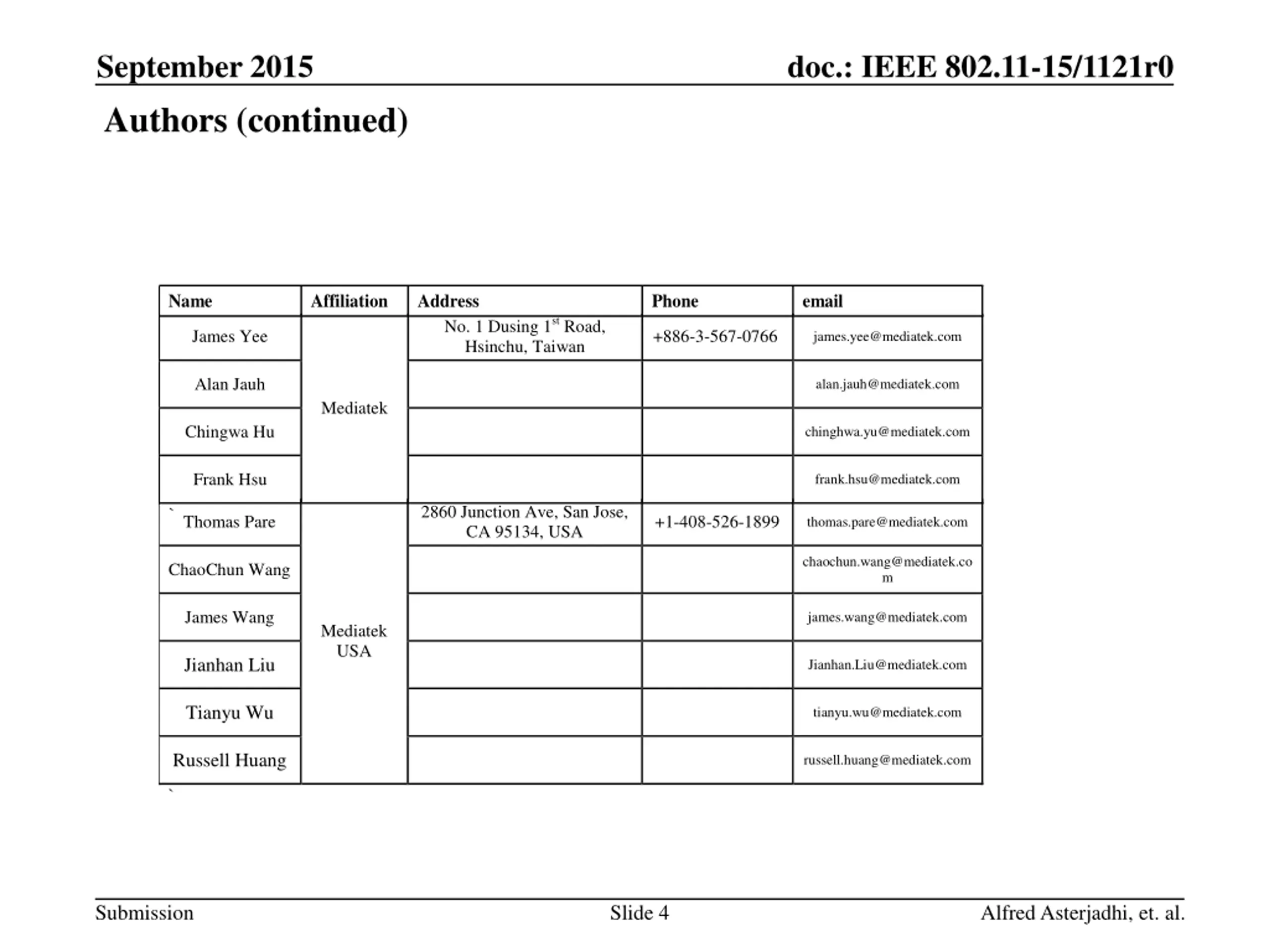 September 2015 doc.: IEEE 802.11-15/1121r0 Authors (continued) Name Affiliation Address Phone email Ron Porat rporat@broadcom.com Matthew Fischer mfischer@broadcom.com Sriram Broadcom Venkateswaran Tu Nguyen Vinko Erceg 5488 Marvell Lane, Santa Clara, CA, 95054 Lei Wang 858-205-7286 Leileiw@marvell.com Hongyuan Zhang hongyuan@marvell.com Yakun Sun yakunsun@marvell.com Liwen Chu liwenchu@marvell.com Jinjing Jiang jinjing@marvell.com Marvell Yan Zhang yzhang@marvell.com Rui Cao ruicao@marvell.com Sudhir Srinivasa sudhirs@marvell.com Saga Tamhane sagar@marvell.com Mao Yu my@marvel..com Edward Au edwardau@marvell.com Hui-Ling Lu hlou@marvell.com Submission Slide 3 Alfred Asterjadhi, et. al.