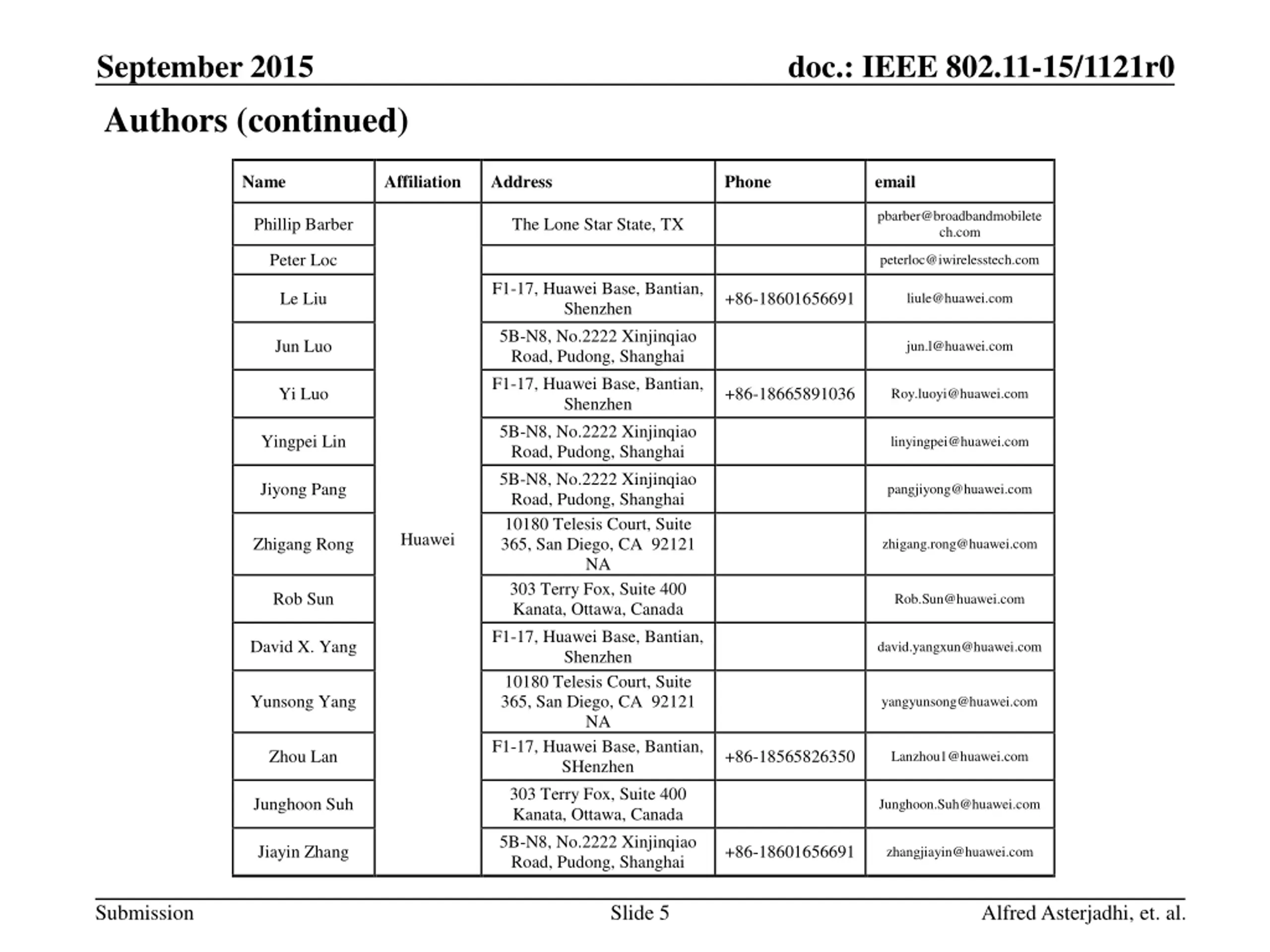 September 2015 doc.: IEEE 802.11-15/1121r0 Authors (continued) Name Affiliation Address Phone email pbarber@broadbandmobilete ch.com Phillip Barber The Lone Star State, TX Peter Loc peterloc@iwirelesstech.com F1-17, Huawei Base, Bantian, Shenzhen 5B-N8, No.2222 Xinjinqiao Road, Pudong, Shanghai F1-17, Huawei Base, Bantian, Shenzhen 5B-N8, No.2222 Xinjinqiao Road, Pudong, Shanghai 5B-N8, No.2222 Xinjinqiao Road, Pudong, Shanghai 10180 Telesis Court, Suite 365, San Diego, CA 92121 NA 303 Terry Fox, Suite 400 Kanata, Ottawa, Canada F1-17, Huawei Base, Bantian, Shenzhen 10180 Telesis Court, Suite 365, San Diego, CA 92121 NA F1-17, Huawei Base, Bantian, SHenzhen 303 Terry Fox, Suite 400 Kanata, Ottawa, Canada 5B-N8, No.2222 Xinjinqiao Road, Pudong, Shanghai Le Liu +86-18601656691 liule@huawei.com Jun Luo jun.l@huawei.com Yi Luo +86-18665891036 Roy.luoyi@huawei.com Yingpei Lin linyingpei@huawei.com Jiyong Pang pangjiyong@huawei.com Huawei Zhigang Rong zhigang.rong@huawei.com Rob Sun Rob.Sun@huawei.com David X. Yang david.yangxun@huawei.com Yunsong Yang yangyunsong@huawei.com Zhou Lan +86-18565826350 Lanzhou1@huawei.com Junghoon Suh Junghoon.Suh@huawei.com Jiayin Zhang +86-18601656691 zhangjiayin@huawei.com Submission Slide 5 Alfred Asterjadhi, et. al.