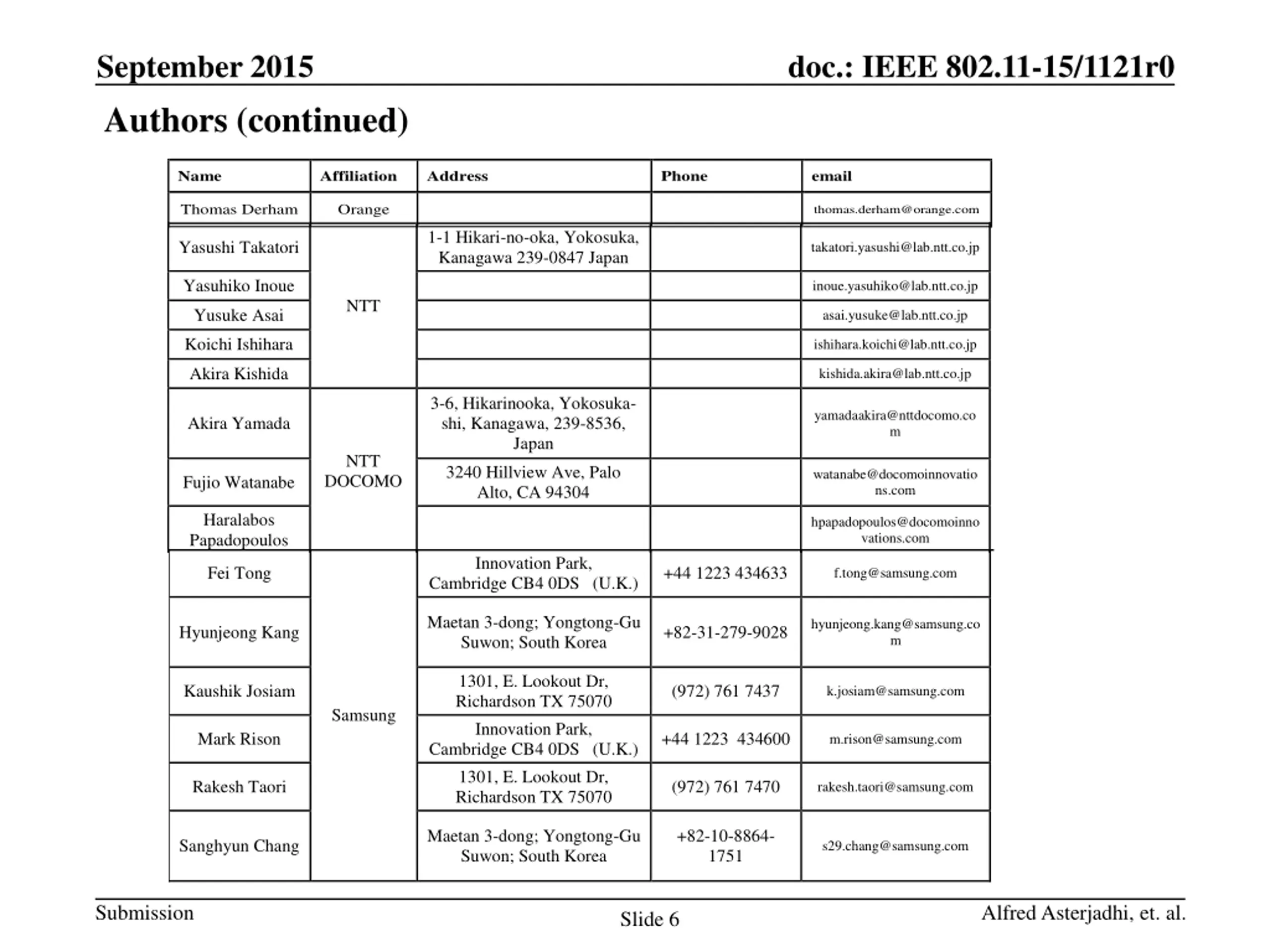 September 2015 doc.: IEEE 802.11-15/1121r0 Authors (continued) Name Affiliation Address Phone email Thomas Derham Orange thomas.derham@orange.com 1-1 Hikari-no-oka, Yokosuka, Kanagawa 239-0847 Japan Yasushi Takatori takatori.yasushi@lab.ntt.co.jp Yasuhiko Inoue inoue.yasuhiko@lab.ntt.co.jp NTT Yusuke Asai asai.yusuke@lab.ntt.co.jp Koichi Ishihara ishihara.koichi@lab.ntt.co.jp Akira Kishida kishida.akira@lab.ntt.co.jp 3-6, Hikarinooka, Yokosuka- shi, Kanagawa, 239-8536, Japan yamadaakira@nttdocomo.co m Akira Yamada NTT 3240 Hillview Ave, Palo Alto, CA 94304 watanabe@docomoinnovatio ns.com DOCOMO Fujio Watanabe Haralabos Papadopoulos hpapadopoulos@docomoinno vations.com Innovation Park, Cambridge CB4 0DS (U.K.) Fei Tong +44 1223 434633 f.tong@samsung.com Maetan 3-dong; Yongtong-Gu Suwon; South Korea hyunjeong.kang@samsung.co m Hyunjeong Kang +82-31-279-9028 1301, E. Lookout Dr, Richardson TX 75070 Innovation Park, Cambridge CB4 0DS (U.K.) +44 1223 434600 1301, E. Lookout Dr, Richardson TX 75070 Kaushik Josiam (972) 761 7437 k.josiam@samsung.com Samsung Mark Rison m.rison@samsung.com Rakesh Taori (972) 761 7470 rakesh.taori@samsung.com Maetan 3-dong; Yongtong-Gu Suwon; South Korea +82-10-8864- 1751 Sanghyun Chang s29.chang@samsung.com Submission Alfred Asterjadhi, et. al. Slide 6