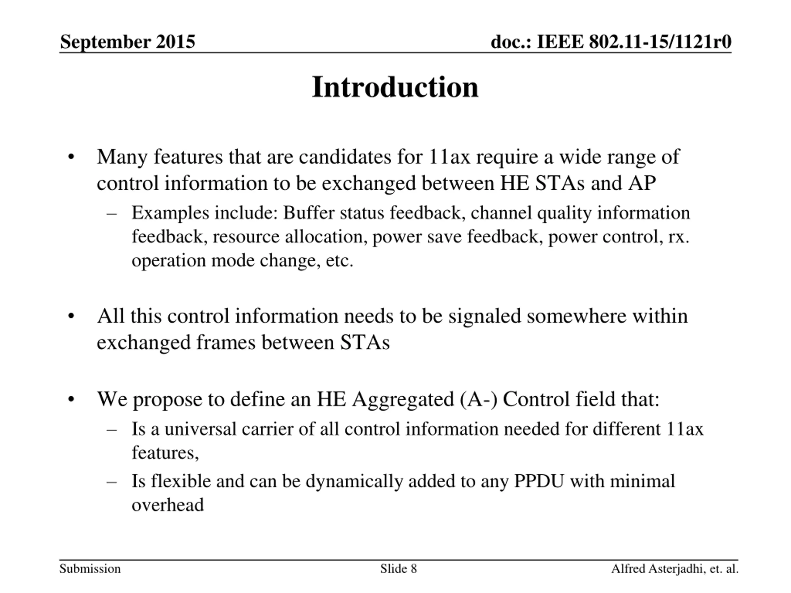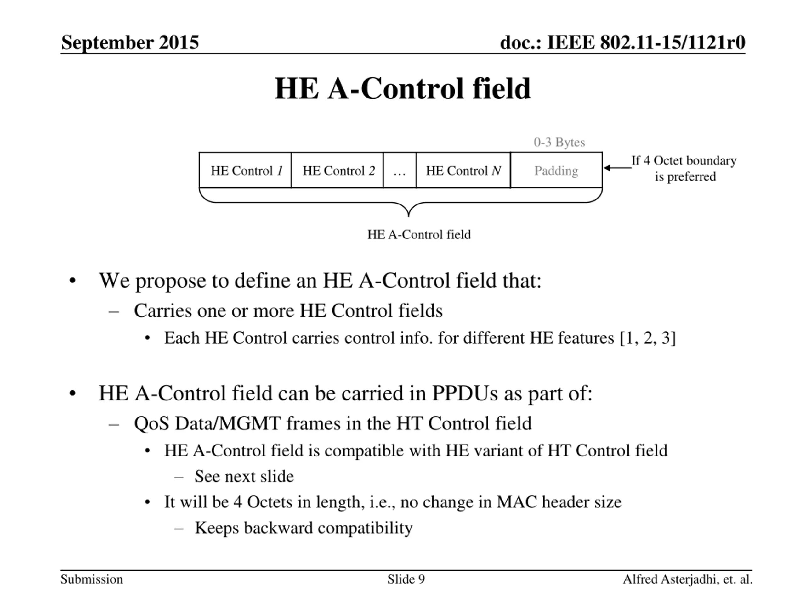 September 2015 doc.: IEEE 802.11-15/1121r0 Introduction Many features that are candidates for 11ax require a wide range of control information to be exchanged between HE STAs and AP Examples include: Buffer status feedback, channel quality information feedback, resource allocation, power save feedback, power control, rx. operation mode change, etc. All this control information needs to be signaled somewhere within exchanged frames between STAs We propose to define an HE Aggregated (A-) Control field that: Is a universal carrier of all control information needed for different 11ax features, Is flexible and can be dynamically added to any PPDU with minimal overhead Submission Slide 8 Alfred Asterjadhi, et. al.