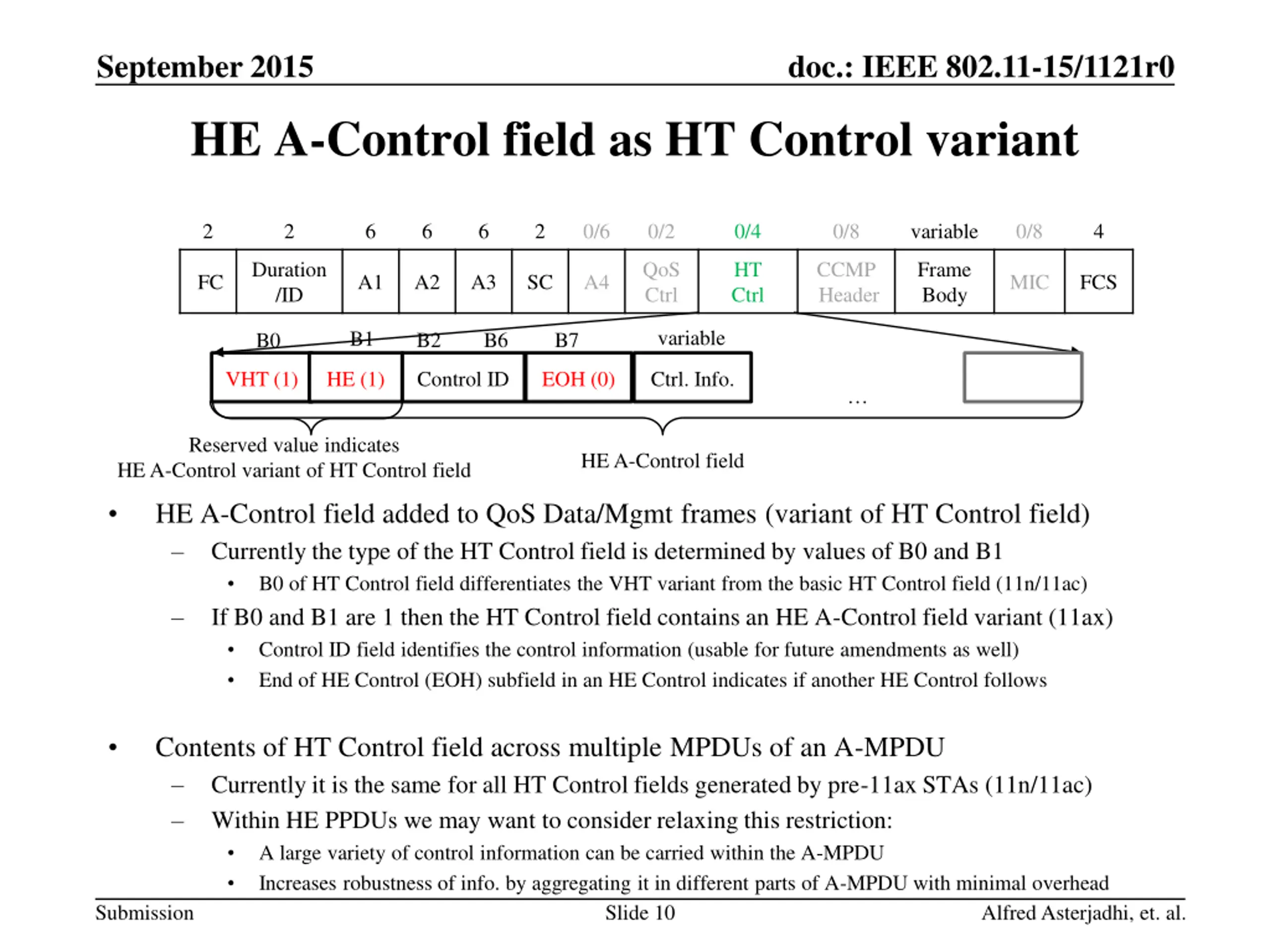 September 2015 doc.: IEEE 802.11-15/1121r0 HE A-Control field 0-3 Bytes If 4 Octet boundary is preferred Padding HE Control 1 HE Control 2 HE Control N HE A-Control field We propose to define an HE A-Control field that: Carries one or more HE Control fields Each HE Control carries control info. for different HE features [1, 2, 3] HE A-Control field can be carried in PPDUs as part of: QoS Data/MGMT frames in the HT Control field HE A-Control field is compatible with HE variant of HT Control field See next slide It will be 4 Octets in length, i.e., no change in MAC header size Keeps backward compatibility Submission Slide 9 Alfred Asterjadhi, et. al.