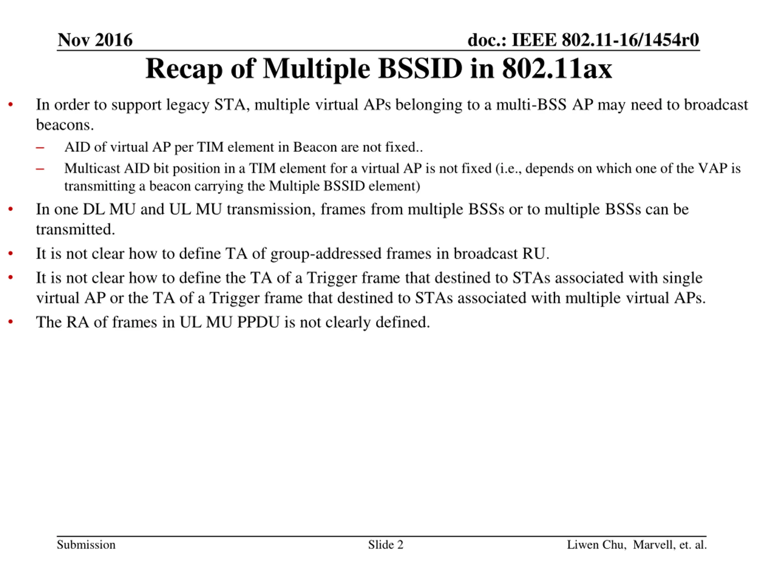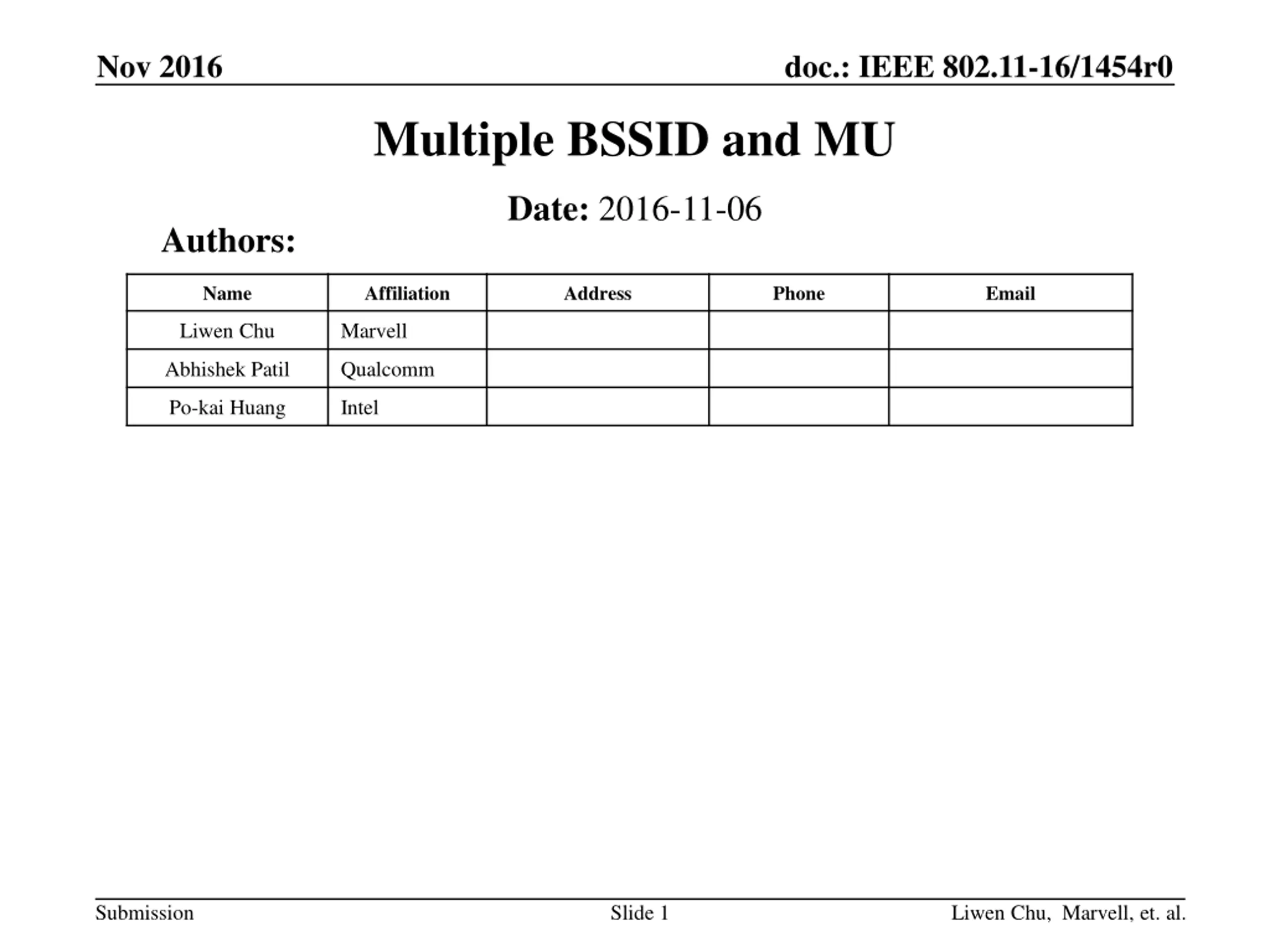 Nov 2016 doc.: IEEE 802.11-16/1454r0 Multiple BSSID and MU Date: 2016-11-06 Authors: Name Affiliation Address Phone Email Liwen Chu Marvell Abhishek Patil Qualcomm Po-kai Huang Intel Submission Slide 1 Liwen Chu, Marvell, et. al.
