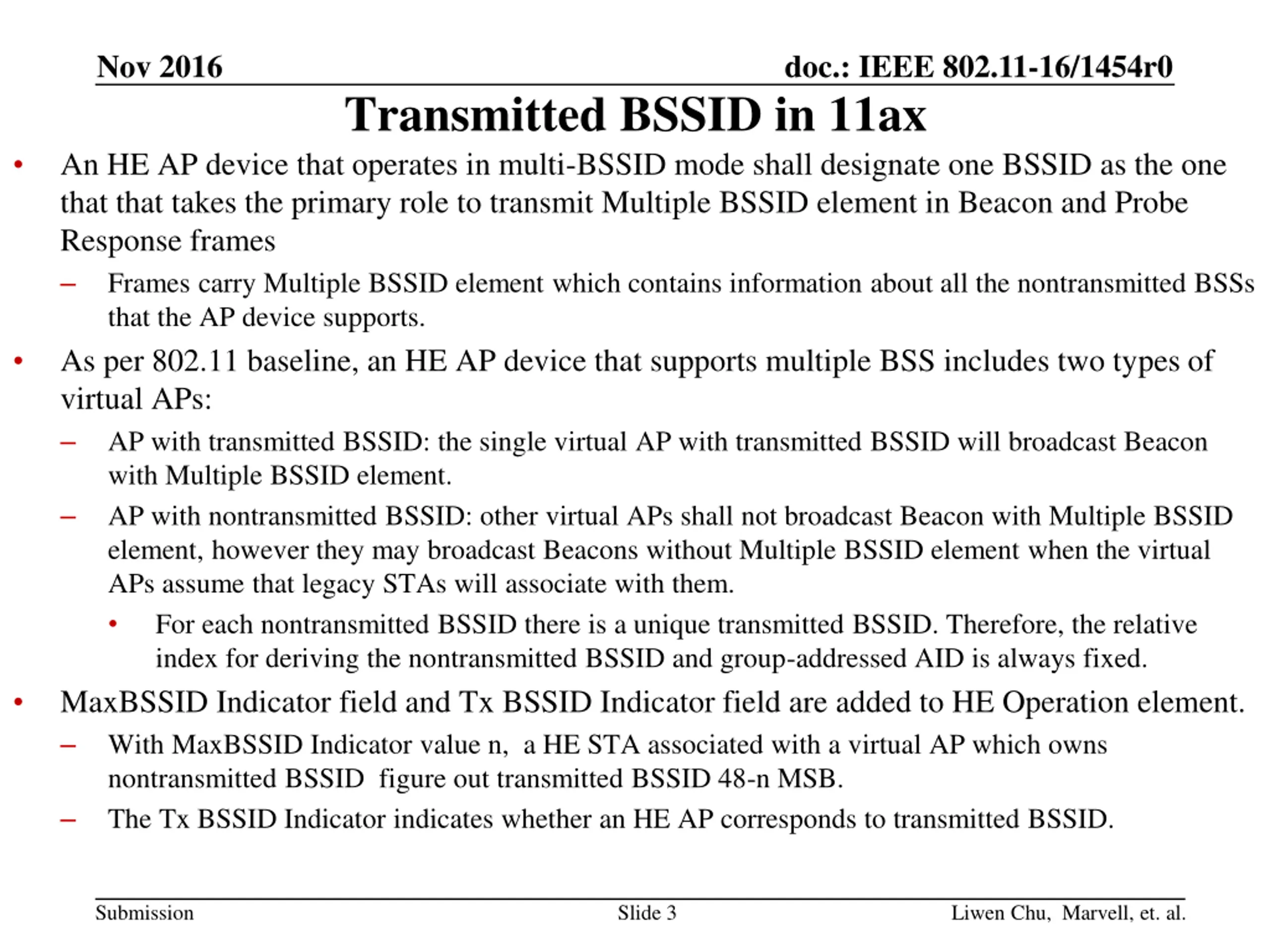 Nov 2016 doc.: IEEE 802.11-16/1454r0 Recap of Multiple BSSID in 802.11ax In order to support legacy STA, multiple virtual APs belonging to a multi-BSS AP may need to broadcast beacons. AID of virtual AP per TIM element in Beacon are not fixed.. Multicast AID bit position in a TIM element for a virtual AP is not fixed (i.e., depends on which one of the VAP is transmitting a beacon carrying the Multiple BSSID element) In one DL MU and UL MU transmission, frames from multiple BSSs or to multiple BSSs can be transmitted. It is not clear how to define TA of group-addressed frames in broadcast RU. It is not clear how to define the TA of a Trigger frame that destined to STAs associated with single virtual AP or the TA of a Trigger frame that destined to STAs associated with multiple virtual APs. The RA of frames in UL MU PPDU is not clearly defined. Submission Slide 2 Liwen Chu, Marvell, et. al.