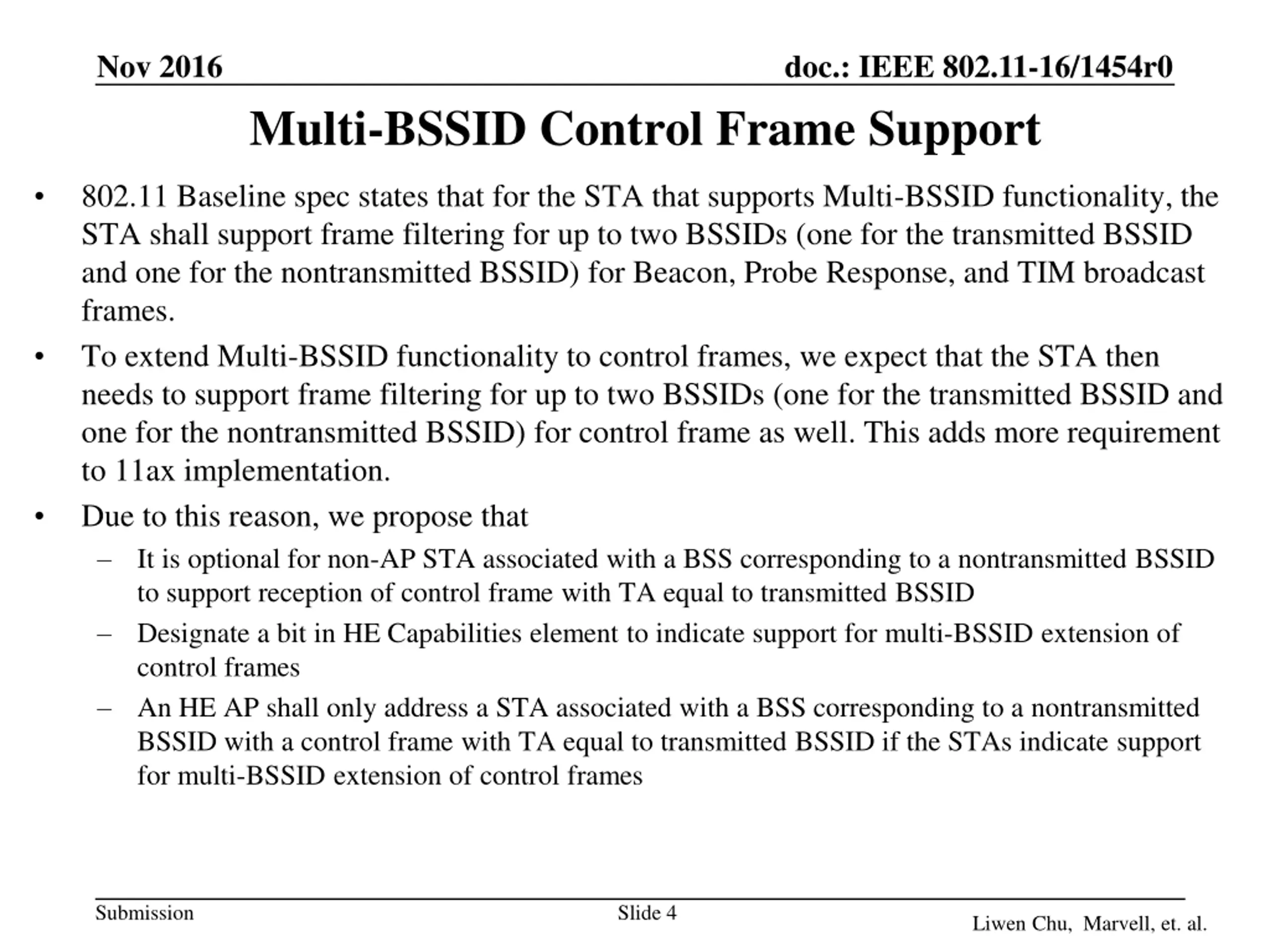Nov 2016 doc.: IEEE 802.11-16/1454r0 Transmitted BSSID in 11ax An HE AP device that operates in multi-BSSID mode shall designate one BSSID as the one that that takes the primary role to transmit Multiple BSSID element in Beacon and Probe Response frames Frames carry Multiple BSSID element which contains information about all the nontransmitted BSSs that the AP device supports. As per 802.11 baseline, an HE AP device that supports multiple BSS includes two types of virtual APs: AP with transmitted BSSID: the single virtual AP with transmitted BSSID will broadcast Beacon with Multiple BSSID element. AP with nontransmitted BSSID: other virtual APs shall not broadcast Beacon with Multiple BSSID element, however they may broadcast Beacons without Multiple BSSID element when the virtual APs assume that legacy STAs will associate with them. For each nontransmitted BSSID there is a unique transmitted BSSID. Therefore, the relative index for deriving the nontransmitted BSSID and group-addressed AID is always fixed. MaxBSSID Indicator field and Tx BSSID Indicator field are added to HE Operation element. With MaxBSSID Indicator value n, a HE STA associated with a virtual AP which owns nontransmitted BSSID figure out transmitted BSSID 48-n MSB. The Tx BSSID Indicator indicates whether an HE AP corresponds to transmitted BSSID. Submission Slide 3 Liwen Chu, Marvell, et. al.