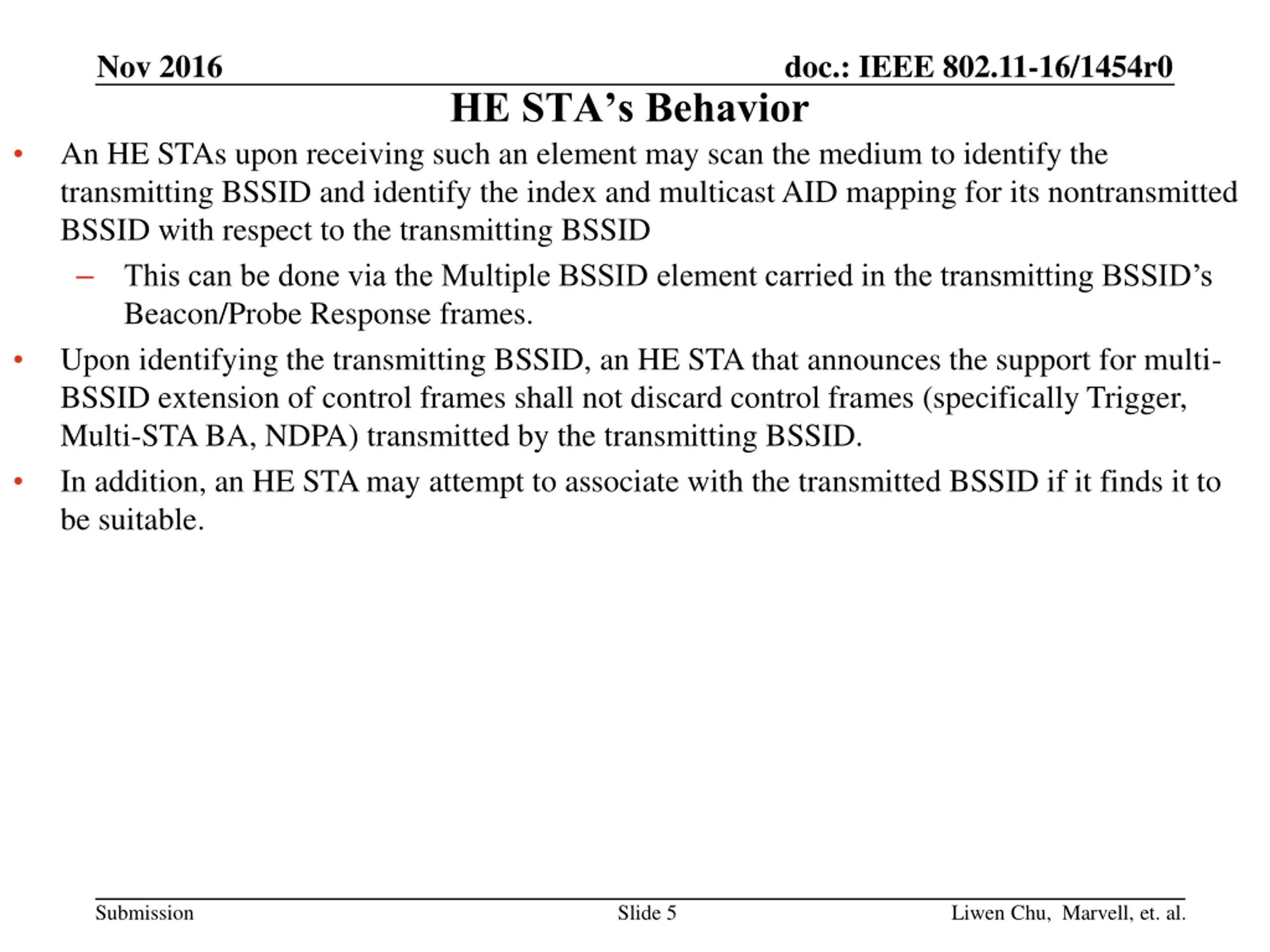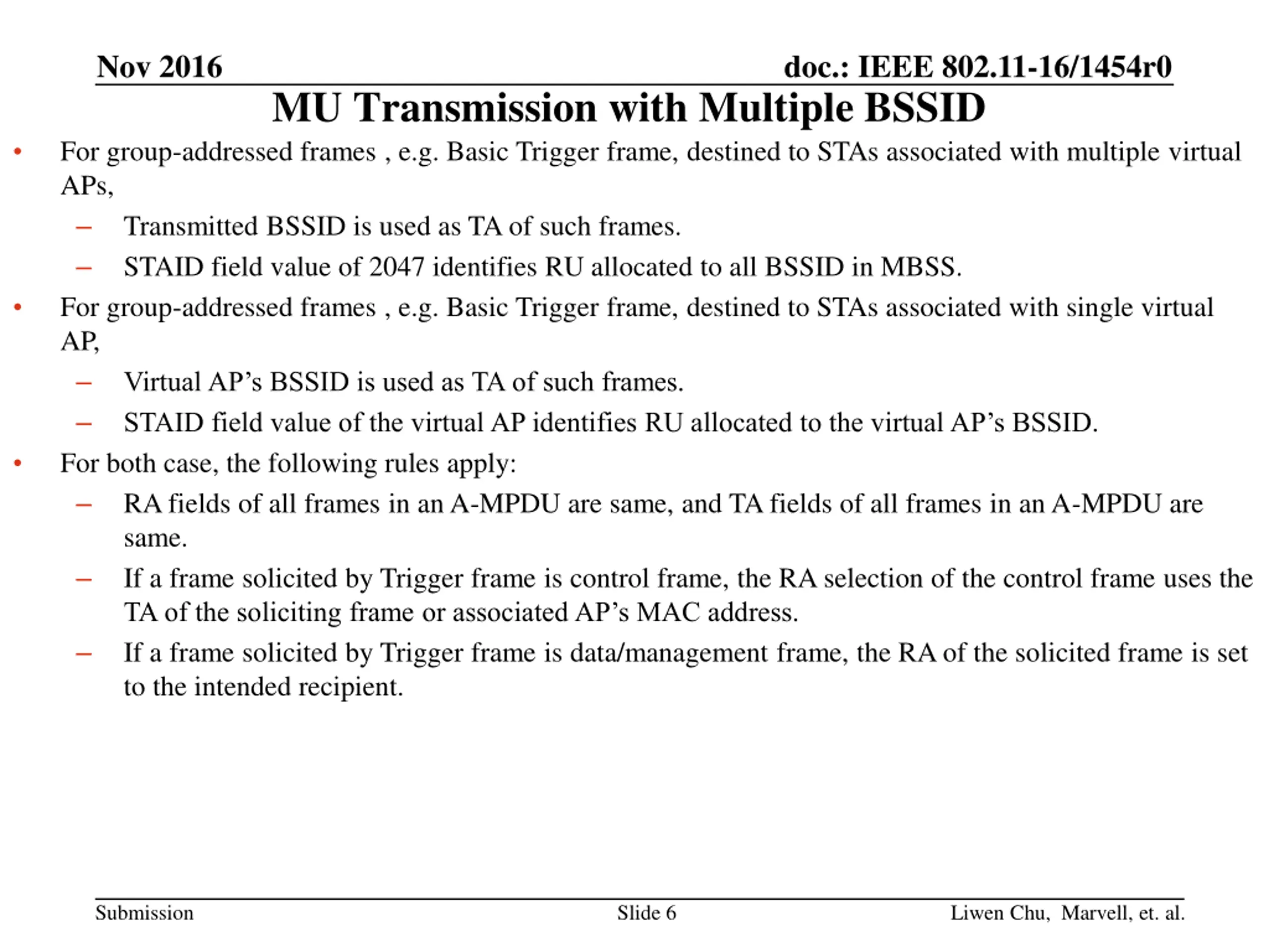 Nov 2016 doc.: IEEE 802.11-16/1454r0 HE STA s Behavior An HE STAs upon receiving such an element may scan the medium to identify the transmitting BSSID and identify the index and multicast AID mapping for its nontransmitted BSSID with respect to the transmitting BSSID This can be done via the Multiple BSSID element carried in the transmitting BSSID s Beacon/Probe Response frames. Upon identifying the transmitting BSSID, an HE STA that announces the support for multi- BSSID extension of control frames shall not discard control frames (specifically Trigger, Multi-STA BA, NDPA) transmitted by the transmitting BSSID. In addition, an HE STA may attempt to associate with the transmitted BSSID if it finds it to be suitable. Submission Slide 5 Liwen Chu, Marvell, et. al.