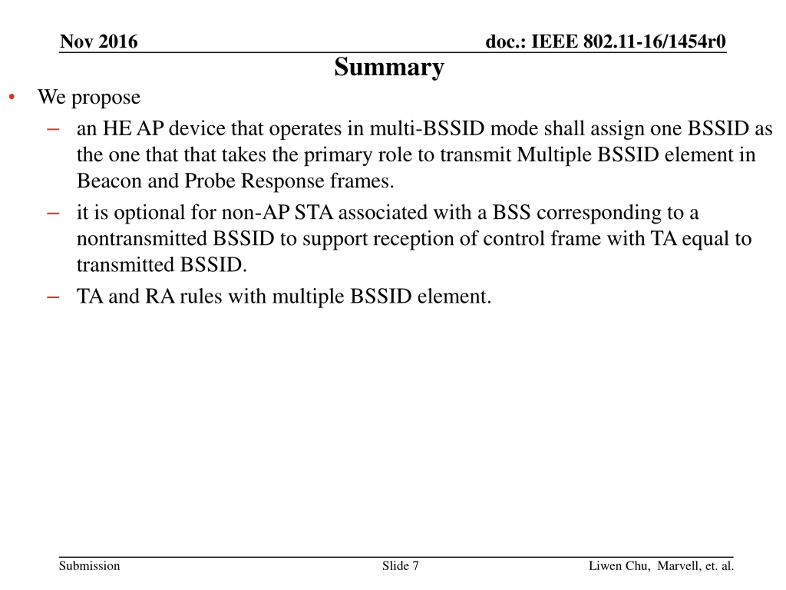 Nov 2016 doc.: IEEE 802.11-16/1454r0 Summary We propose an HE AP device that operates in multi-BSSID mode shall assign one BSSID as the one that that takes the primary role to transmit Multiple BSSID element in Beacon and Probe Response frames. it is optional for non-AP STA associated with a BSS corresponding to a nontransmitted BSSID to support reception of control frame with TA equal to transmitted BSSID. TA and RA rules with multiple BSSID element. Submission Slide 7 Liwen Chu, Marvell, et. al.