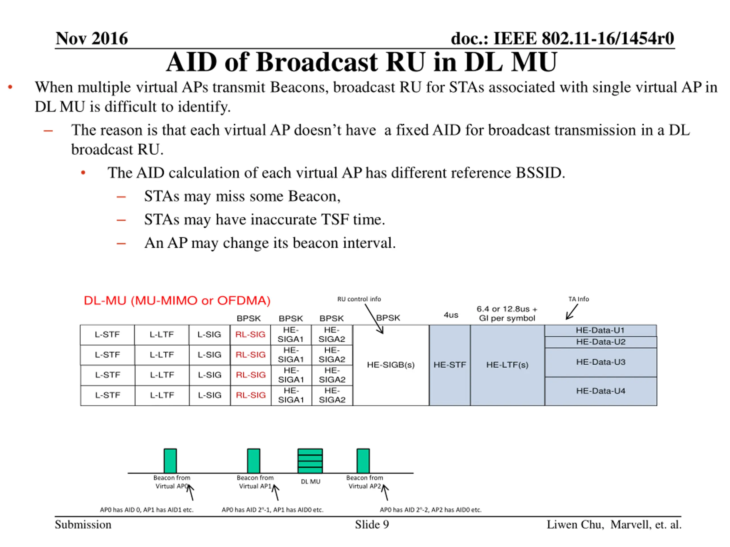 Nov 2016 doc.: IEEE 802.11-16/1454r0 AID of Broadcast RU in DL MU When multiple virtual APs transmit Beacons, broadcast RU for STAs associated with single virtual AP in DL MU is difficult to identify. The reason is that each virtual AP doesn t have a fixed AID for broadcast transmission in a DL broadcast RU. The AID calculation of each virtual AP has different reference BSSID. STAs may miss some Beacon, STAs may have inaccurate TSF time. An AP may change its beacon interval. DL-MU (MU-MIMO or OFDMA) RU control info TA Info 6.4 or 12.8us + GI per symbol 4us BPSK BPSK BPSK BPSK HE- SIGA1 HE- SIGA1 HE- SIGA1 HE- SIGA1 HE- SIGA2 HE- SIGA2 HE- SIGA2 HE- SIGA2 HE-Data-U1 HE-Data-U2 L-STF L-LTF L-SIG RL-SIG L-STF L-LTF L-SIG RL-SIG HE-Data-U3 HE-SIGB(s) HE-STF HE-LTF(s) L-STF L-LTF L-SIG RL-SIG HE-Data-U4 L-STF L-LTF L-SIG RL-SIG Beacon from Virtual AP0 Beacon from Virtual AP1 Beacon from Virtual AP2 DL MU AP0 has AID 2n-1, AP1 has AID0 etc. AP0 has AID 2n-2, AP2 has AID0 etc. AP0 has AID 0, AP1 has AID1 etc. Submission Slide 9 Liwen Chu, Marvell, et. al.