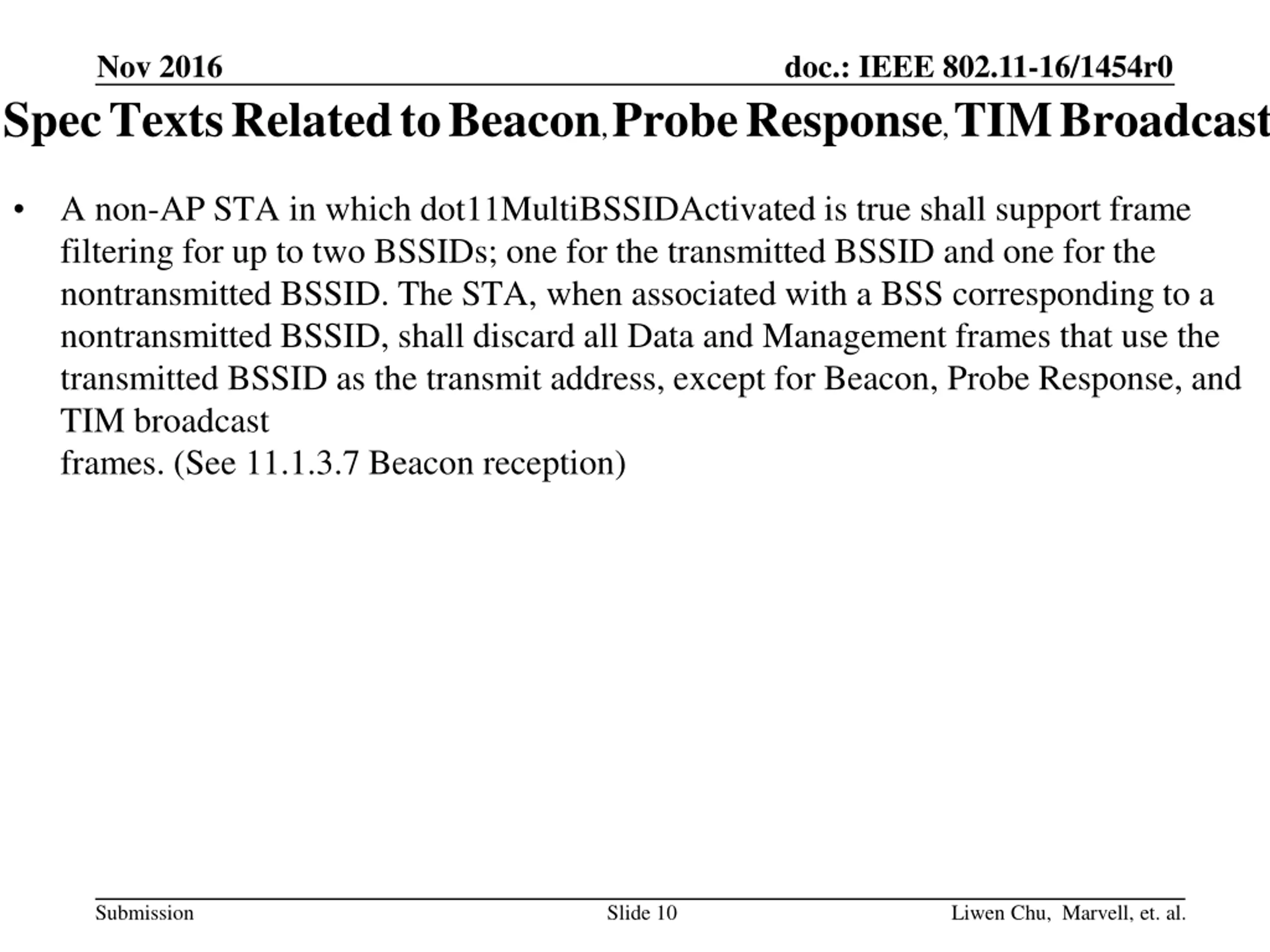 Nov 2016 doc.: IEEE 802.11-16/1454r0 SpecTextsRelatedtoBeacon, ProbeResponse, TIMBroadcast A non-AP STA in which dot11MultiBSSIDActivated is true shall support frame filtering for up to two BSSIDs; one for the transmitted BSSID and one for the nontransmitted BSSID. The STA, when associated with a BSS corresponding to a nontransmitted BSSID, shall discard all Data and Management frames that use the transmitted BSSID as the transmit address, except for Beacon, Probe Response, and TIM broadcast frames. (See 11.1.3.7 Beacon reception) Submission Slide 10 Liwen Chu, Marvell, et. al.