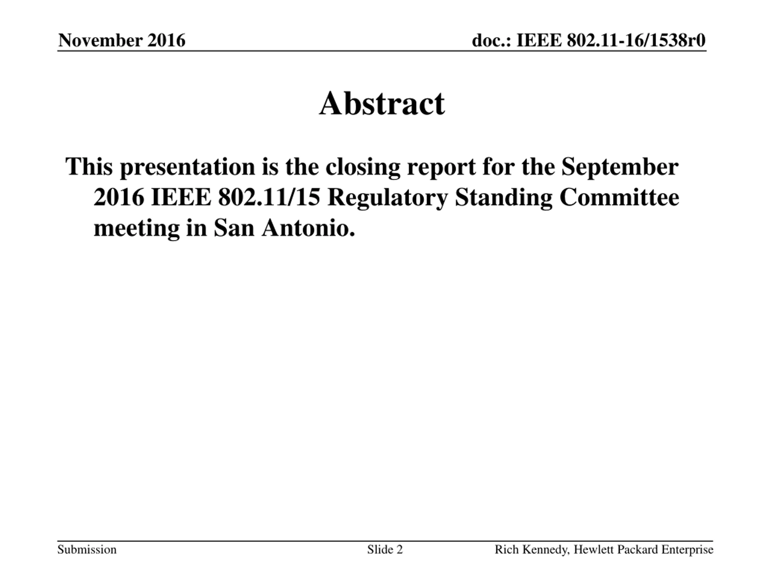 November 2016 doc.: IEEE 802.11-16/1538r0 Abstract This presentation is the closing report for the September 2016 IEEE 802.11/15 Regulatory Standing Committee meeting in San Antonio. Submission Slide 2 Rich Kennedy, Hewlett Packard Enterprise
