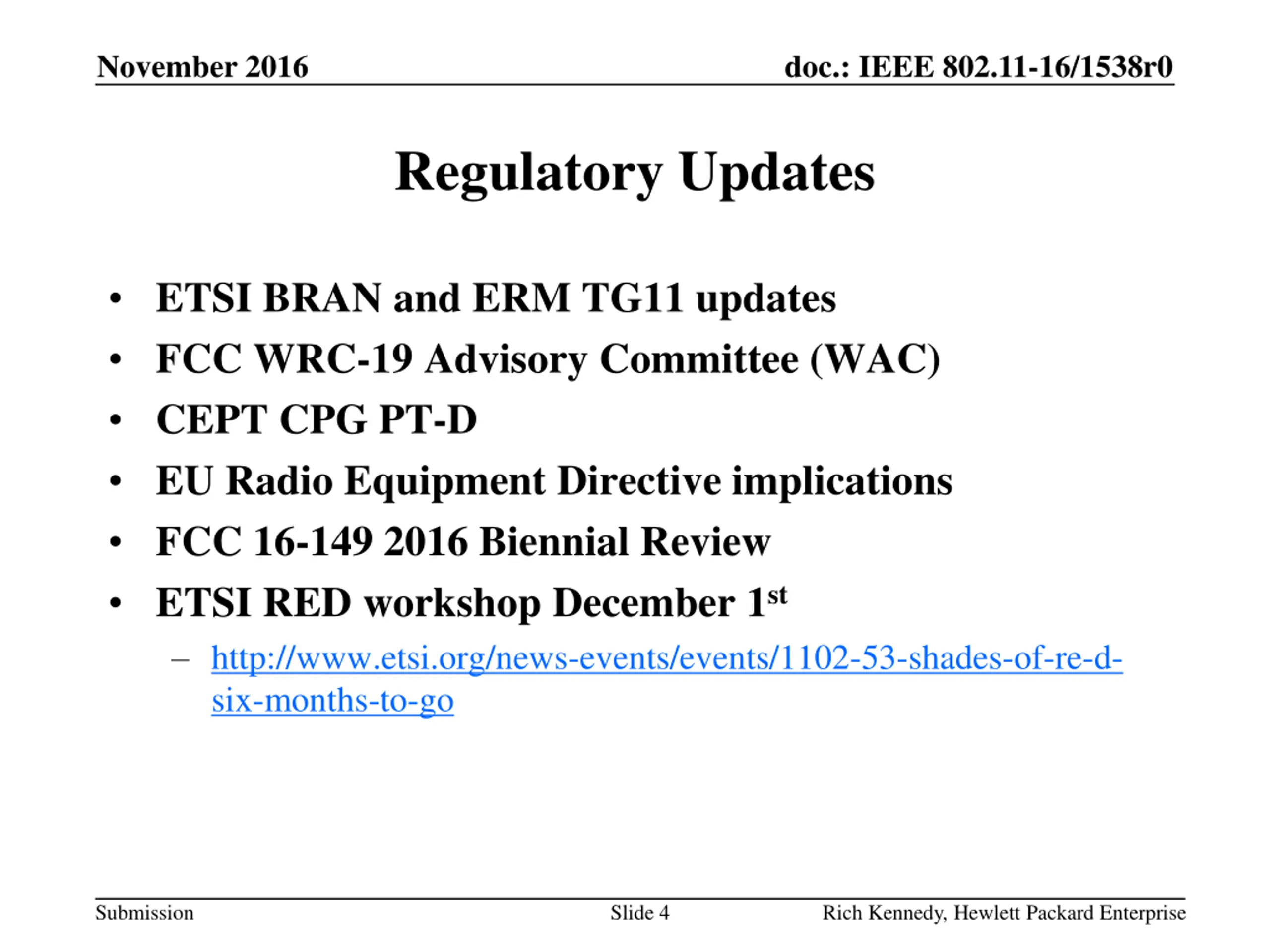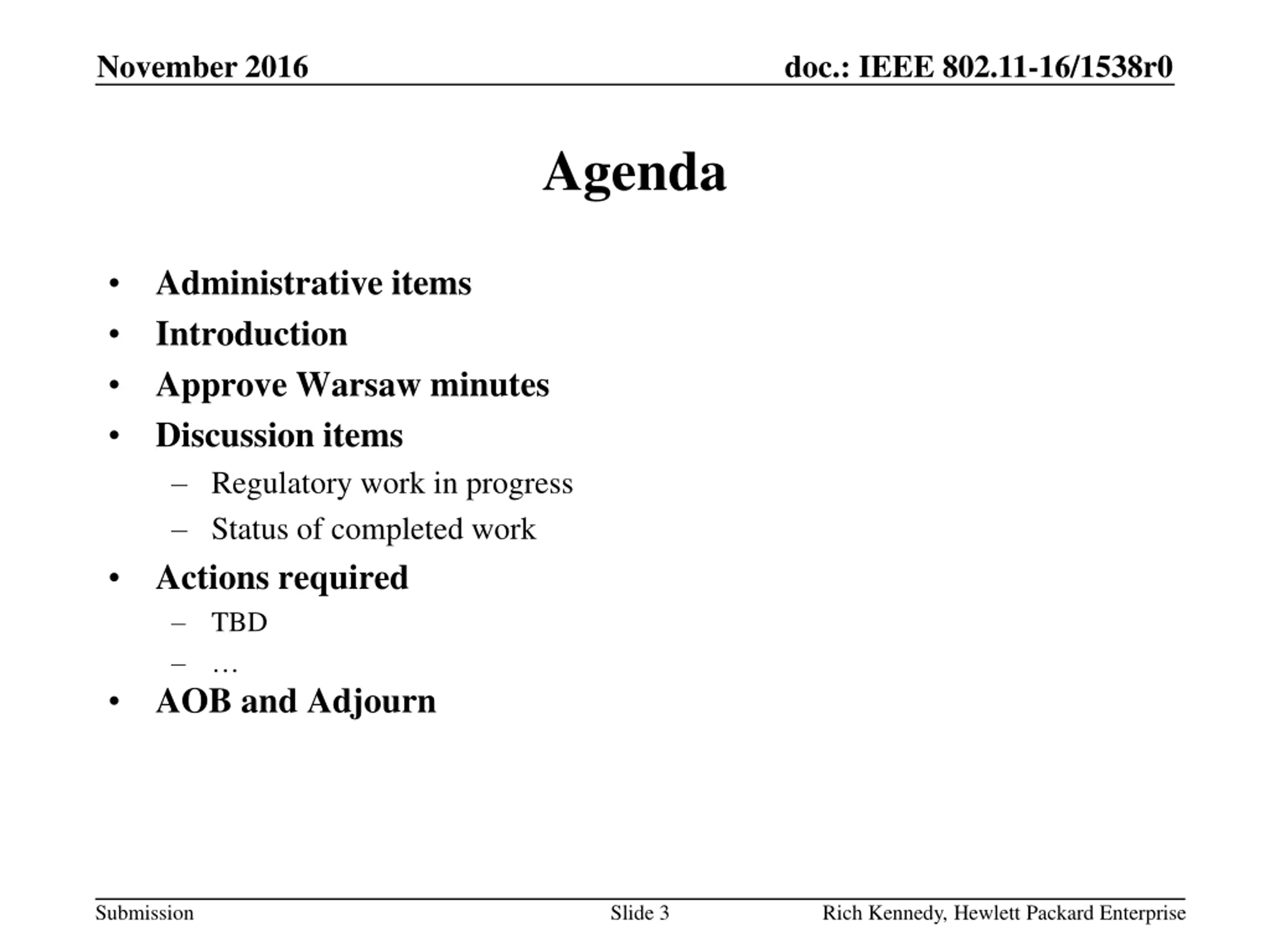November 2016 doc.: IEEE 802.11-16/1538r0 Agenda Administrative items Introduction Approve Warsaw minutes Discussion items Regulatory work in progress Status of completed work Actions required TBD AOB and Adjourn Submission Slide 3 Rich Kennedy, Hewlett Packard Enterprise