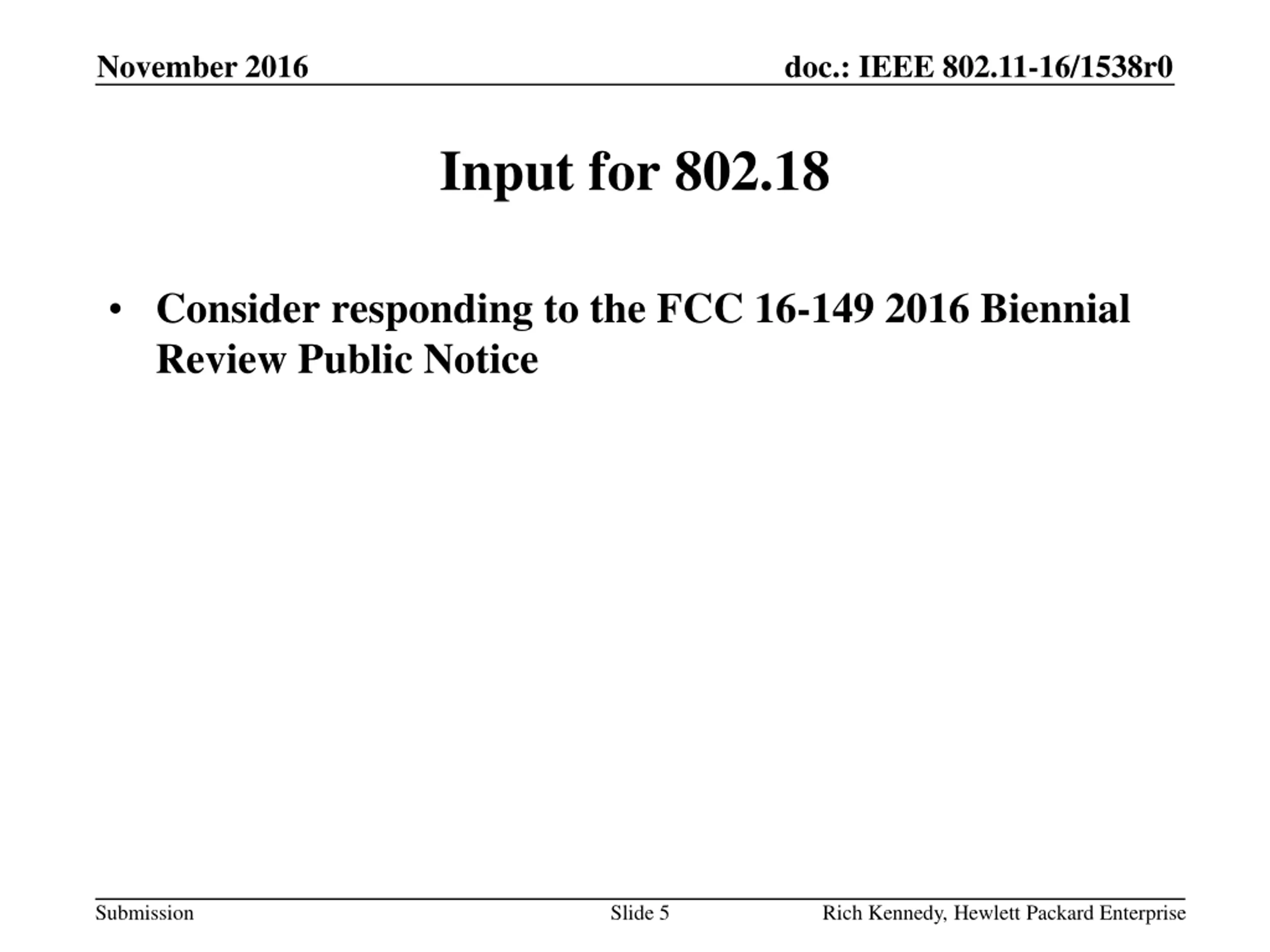 November 2016 doc.: IEEE 802.11-16/1538r0 Input for 802.18 Consider responding to the FCC 16-149 2016 Biennial Review Public Notice Submission Slide 5 Rich Kennedy, Hewlett Packard Enterprise