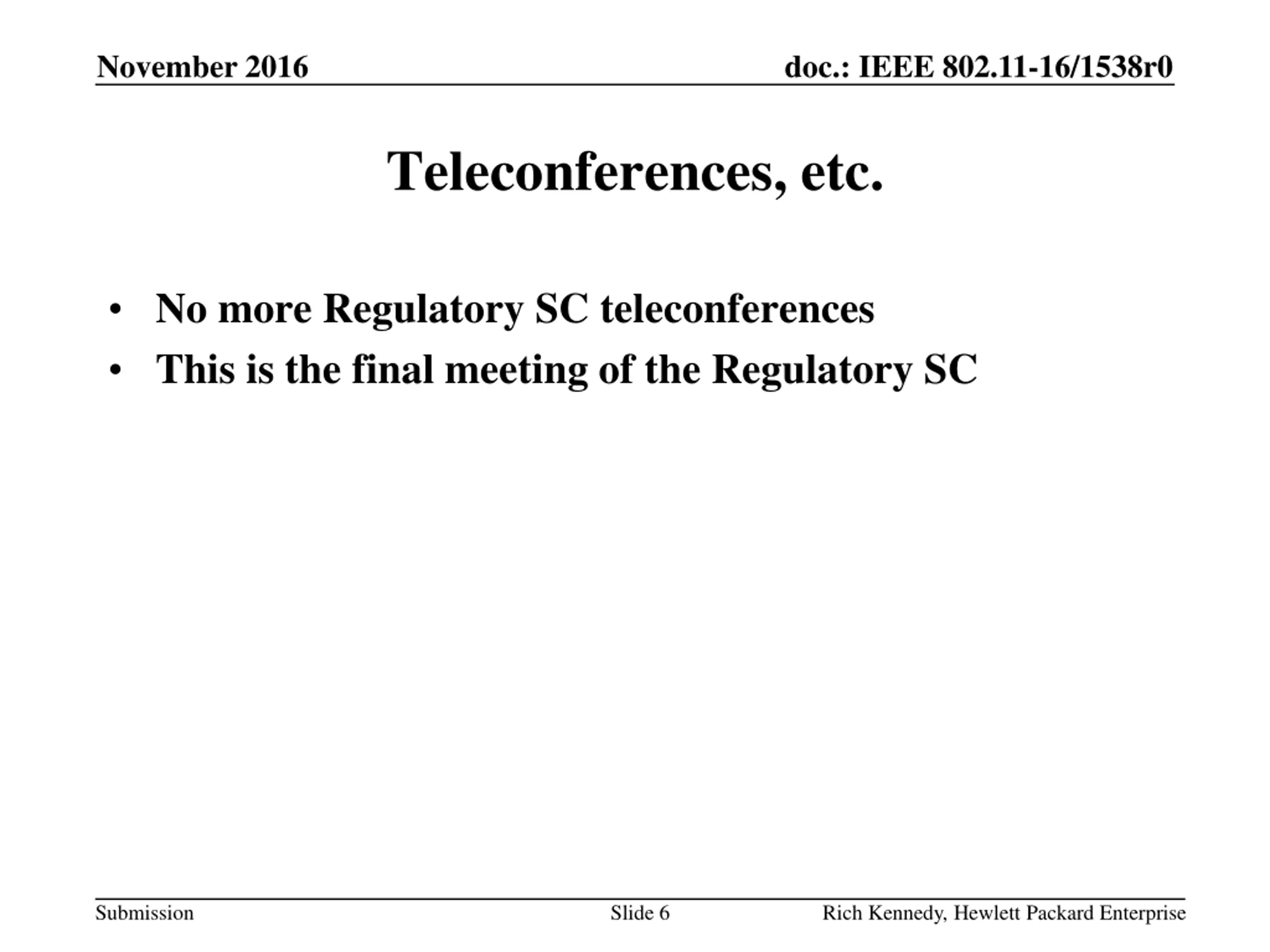 November 2016 doc.: IEEE 802.11-16/1538r0 Teleconferences, etc. No more Regulatory SC teleconferences This is the final meeting of the Regulatory SC Submission Slide 6 Rich Kennedy, Hewlett Packard Enterprise