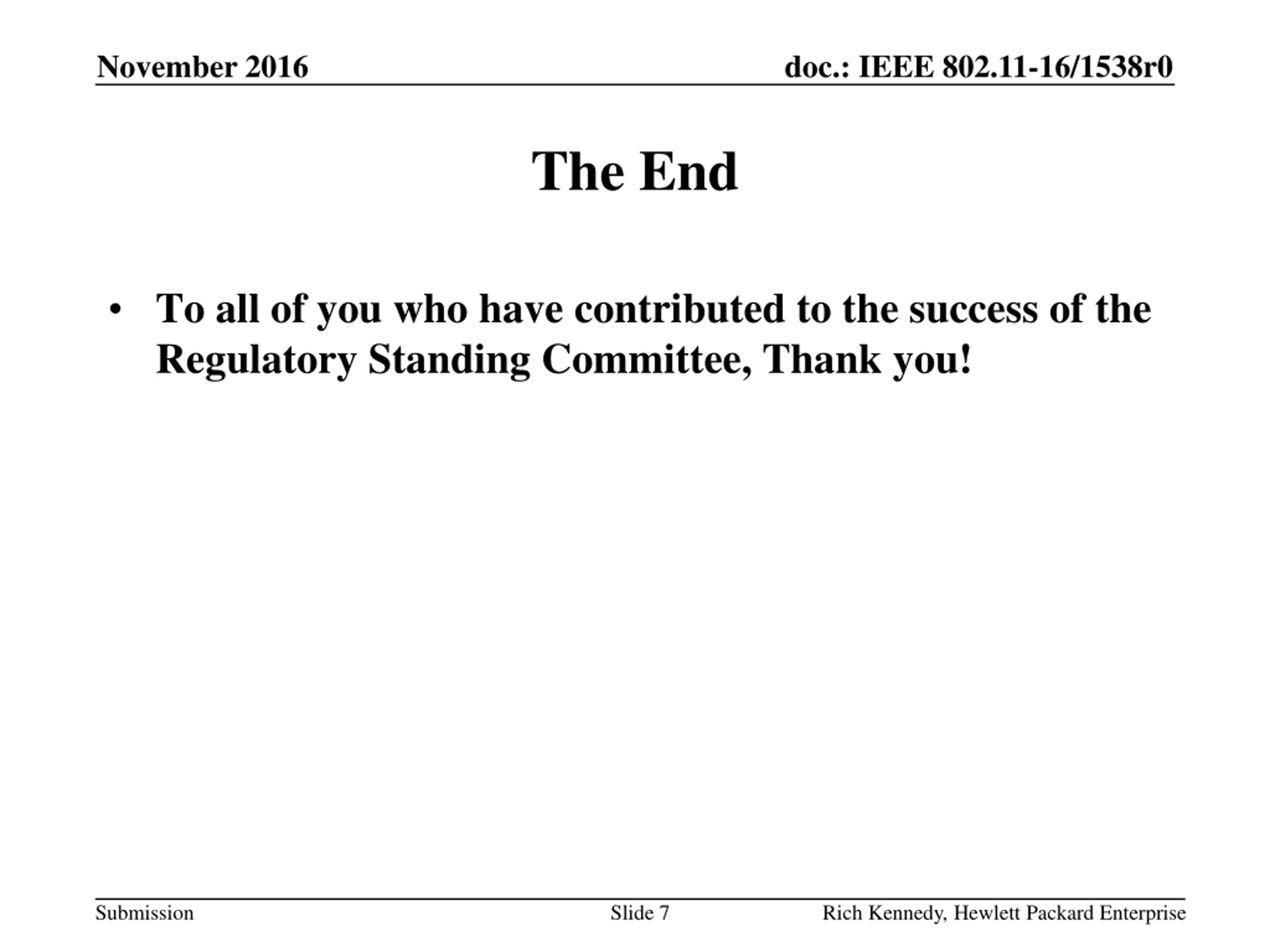 November 2016 doc.: IEEE 802.11-16/1538r0 The End To all of you who have contributed to the success of the Regulatory Standing Committee, Thank you! Submission Slide 7 Rich Kennedy, Hewlett Packard Enterprise
