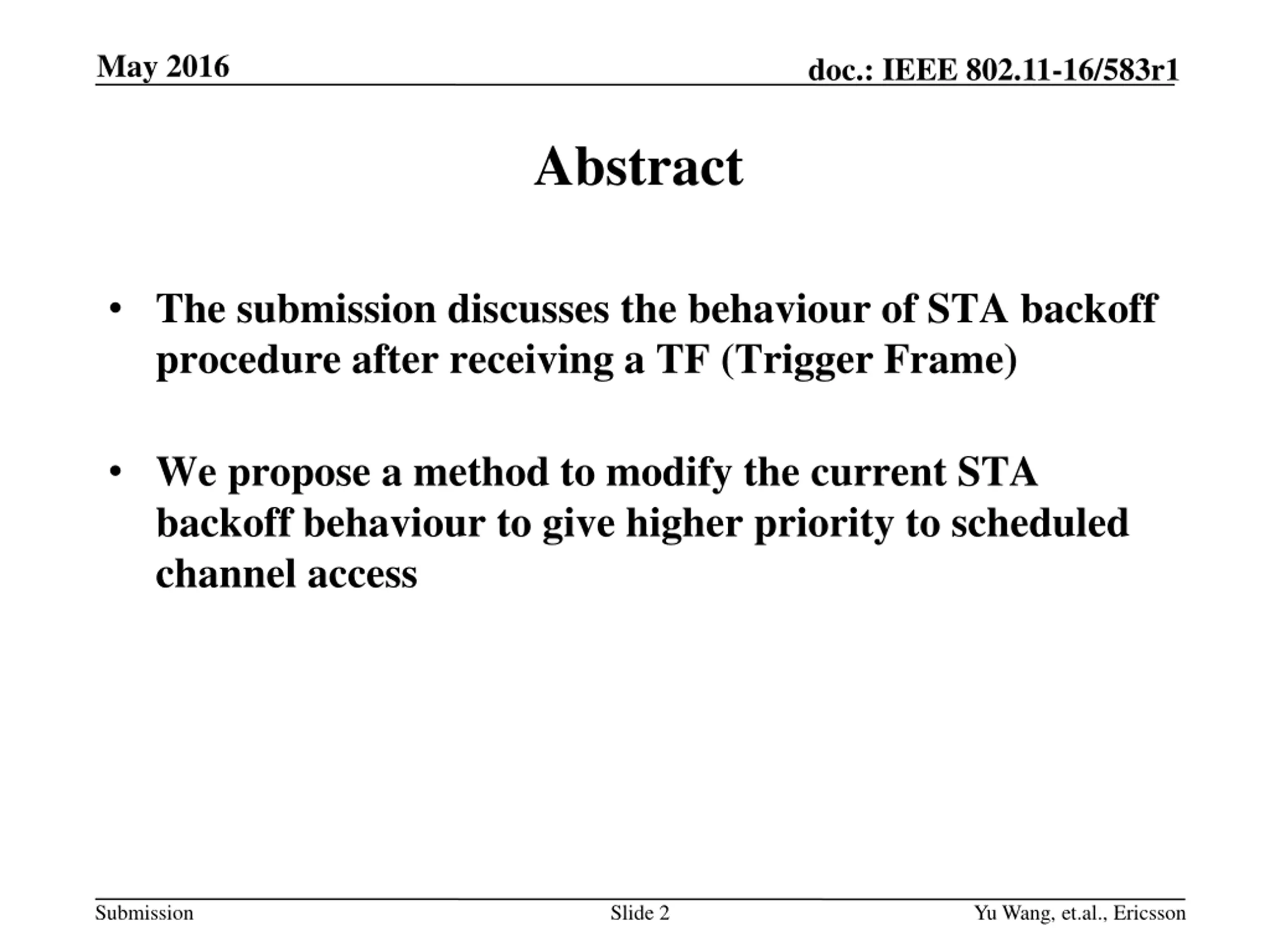 May 2016 doc.: IEEE 802.11-16/583r1 Abstract The submission discusses the behaviour of STA backoff procedure after receiving a TF (Trigger Frame) We propose a method to modify the current STA backoff behaviour to give higher priority to scheduled channel access Submission Slide 2 Yu Wang, et.al., Ericsson