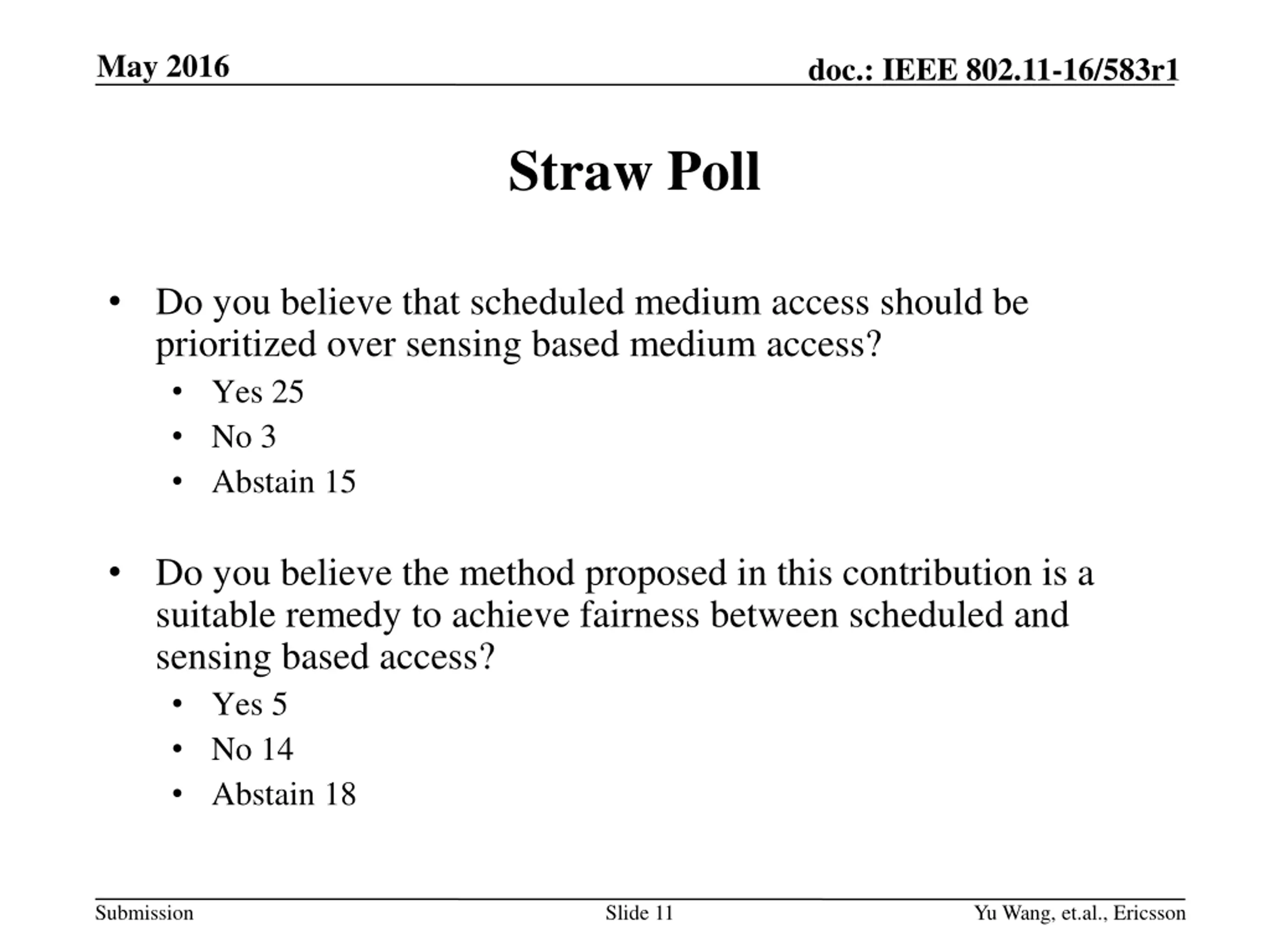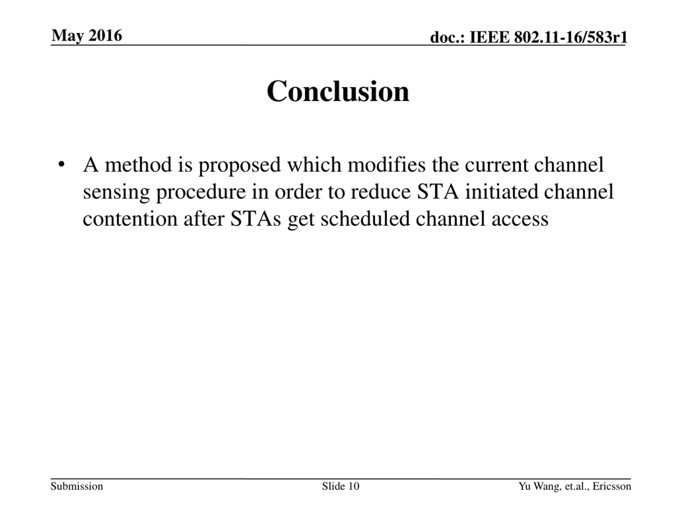 May 2016 doc.: IEEE 802.11-16/583r1 Conclusion A method is proposed which modifies the current channel sensing procedure in order to reduce STA initiated channel contention after STAs get scheduled channel access Submission Slide 10 Yu Wang, et.al., Ericsson