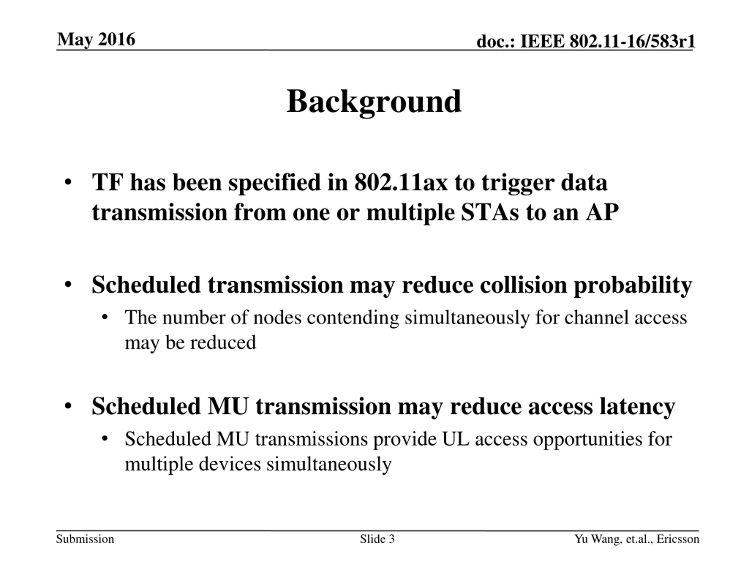 May 2016 doc.: IEEE 802.11-16/583r1 Background TF has been specified in 802.11ax to trigger data transmission from one or multiple STAs to an AP Scheduled transmission may reduce collision probability The number of nodes contending simultaneously for channel access may be reduced Scheduled MU transmission may reduce access latency Scheduled MU transmissions provide UL access opportunities for multiple devices simultaneously Submission Slide 3 Yu Wang, et.al., Ericsson
