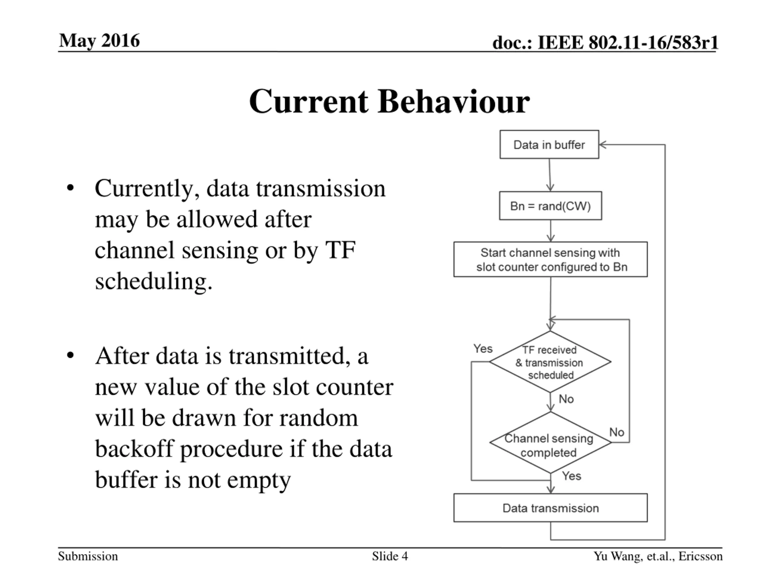May 2016 doc.: IEEE 802.11-16/583r1 Current Behaviour Currently, data transmission may be allowed after channel sensing or by TF scheduling. After data is transmitted, a new value of the slot counter will be drawn for random backoff procedure if the data buffer is not empty Submission Slide 4 Yu Wang, et.al., Ericsson