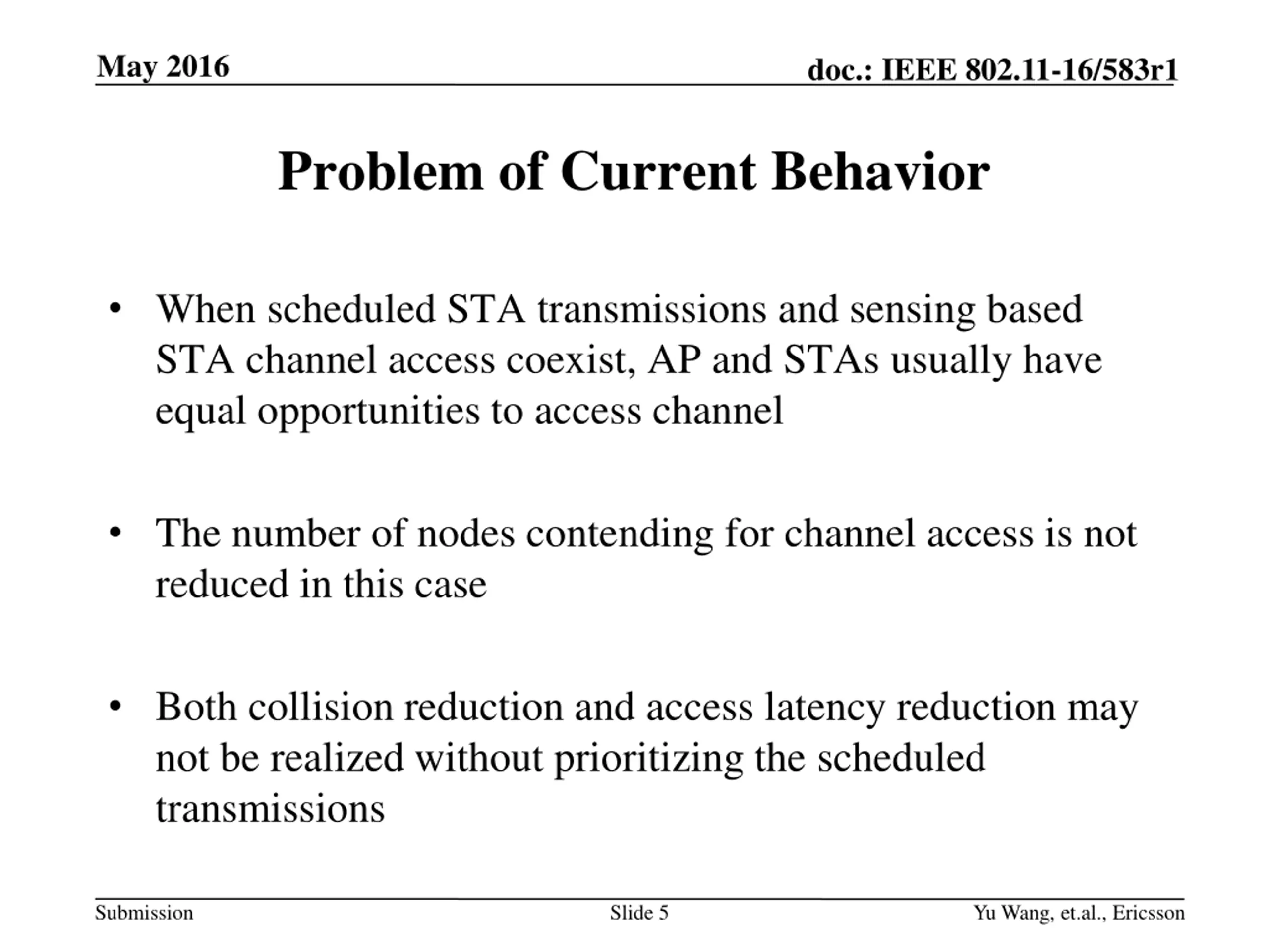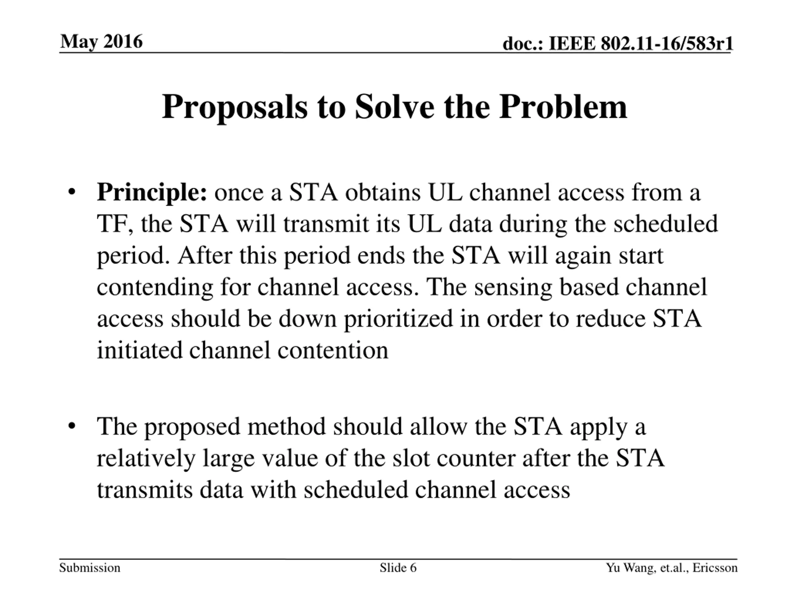 May 2016 doc.: IEEE 802.11-16/583r1 Problem of Current Behavior When scheduled STA transmissions and sensing based STA channel access coexist, AP and STAs usually have equal opportunities to access channel The number of nodes contending for channel access is not reduced in this case Both collision reduction and access latency reduction may not be realized without prioritizing the scheduled transmissions Submission Slide 5 Yu Wang, et.al., Ericsson