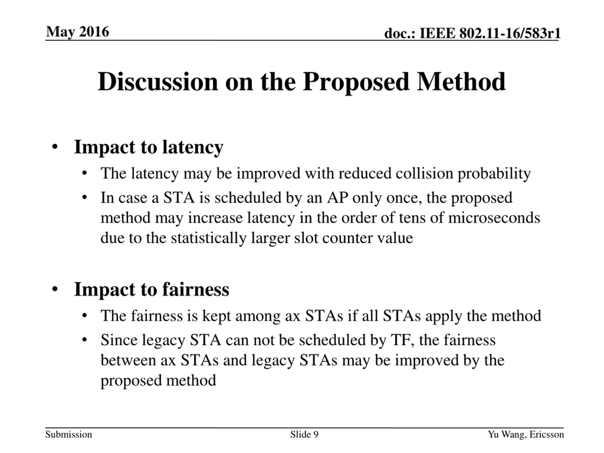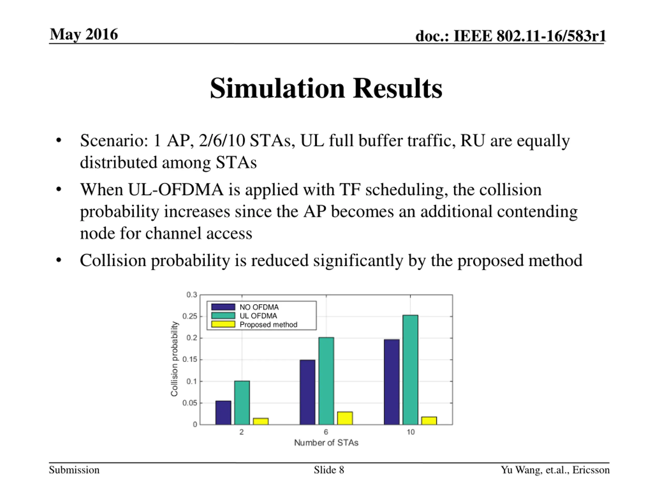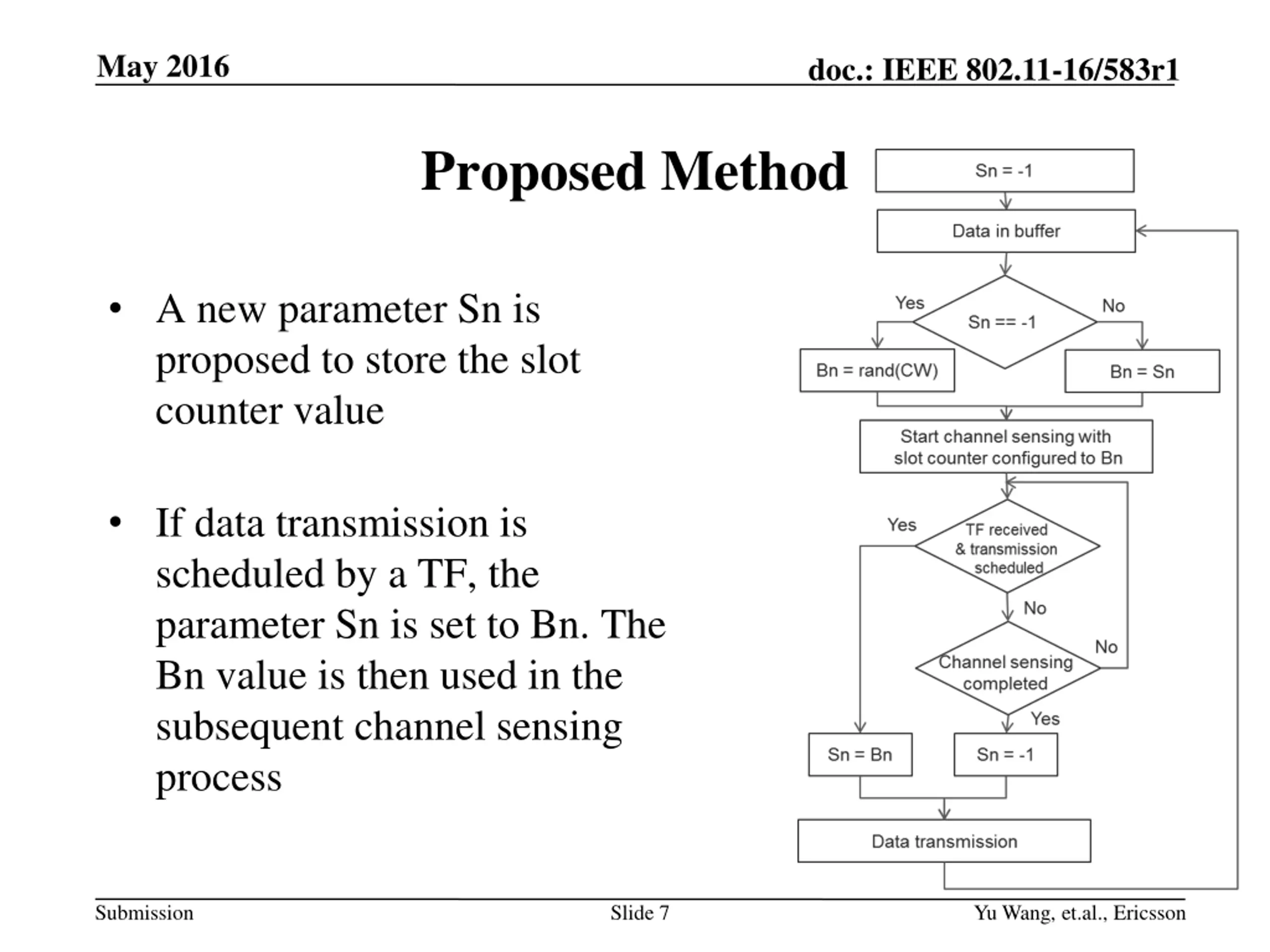 May 2016 doc.: IEEE 802.11-16/583r1 Proposed Method A new parameter Sn is proposed to store the slot counter value If data transmission is scheduled by a TF, the parameter Sn is set to Bn. The Bn value is then used in the subsequent channel sensing process Submission Slide 7 Yu Wang, et.al., Ericsson