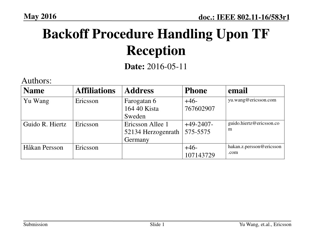 May 2016 doc.: IEEE 802.11-16/583r1 Backoff Procedure Handling Upon TF Reception Date: 2016-05-11 Authors: Name Yu Wang Affiliations Address Ericsson Phone +46- 767602907 email yu.wang@ericsson.com Farogatan 6 164 40 Kista Sweden Ericsson Allee 1 52134 Herzogenrath Germany guido.hiertz@ericsson.co m Guido R. Hiertz Ericsson +49-2407- 575-5575 hakan.z.persson@ericsson .com H kan Persson Ericsson +46- 107143729 Submission Slide 1 Yu Wang, et.al., Ericsson