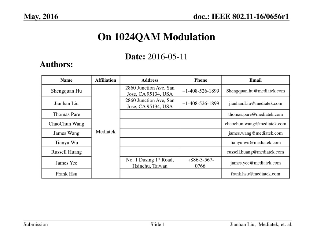 May, 2016 doc.: IEEE 802.11-16/0656r1 On 1024QAM Modulation Date: 2016-05-11 Authors: Name Affiliation Address Phone Email 2860 Junction Ave, San Jose, CA 95134, USA 2860 Junction Ave, San Jose, CA 95134, USA Shengquan Hu +1-408-526-1899 Shengquan.hu@mediatek.com Jianhan Liu +1-408-526-1899 jianhan.Liu@mediatek.com Thomas Pare thomas.pare@mediatek.com ChaoChun Wang chaochun.wang@mediatek.com Mediatek James Wang james.wang@mediatek.com Tianyu Wu tianyu.wu@mediatek.com Russell Huang russell.huang@mediatek.com No. 1 Dusing 1st Road, Hsinchu, Taiwan +886-3-567- 0766 James Yee james.yee@mediatek.com Frank Hsu frank.hsu@mediatek.com Submission Slide 1 Jianhan Liu, Mediatek, et. al.