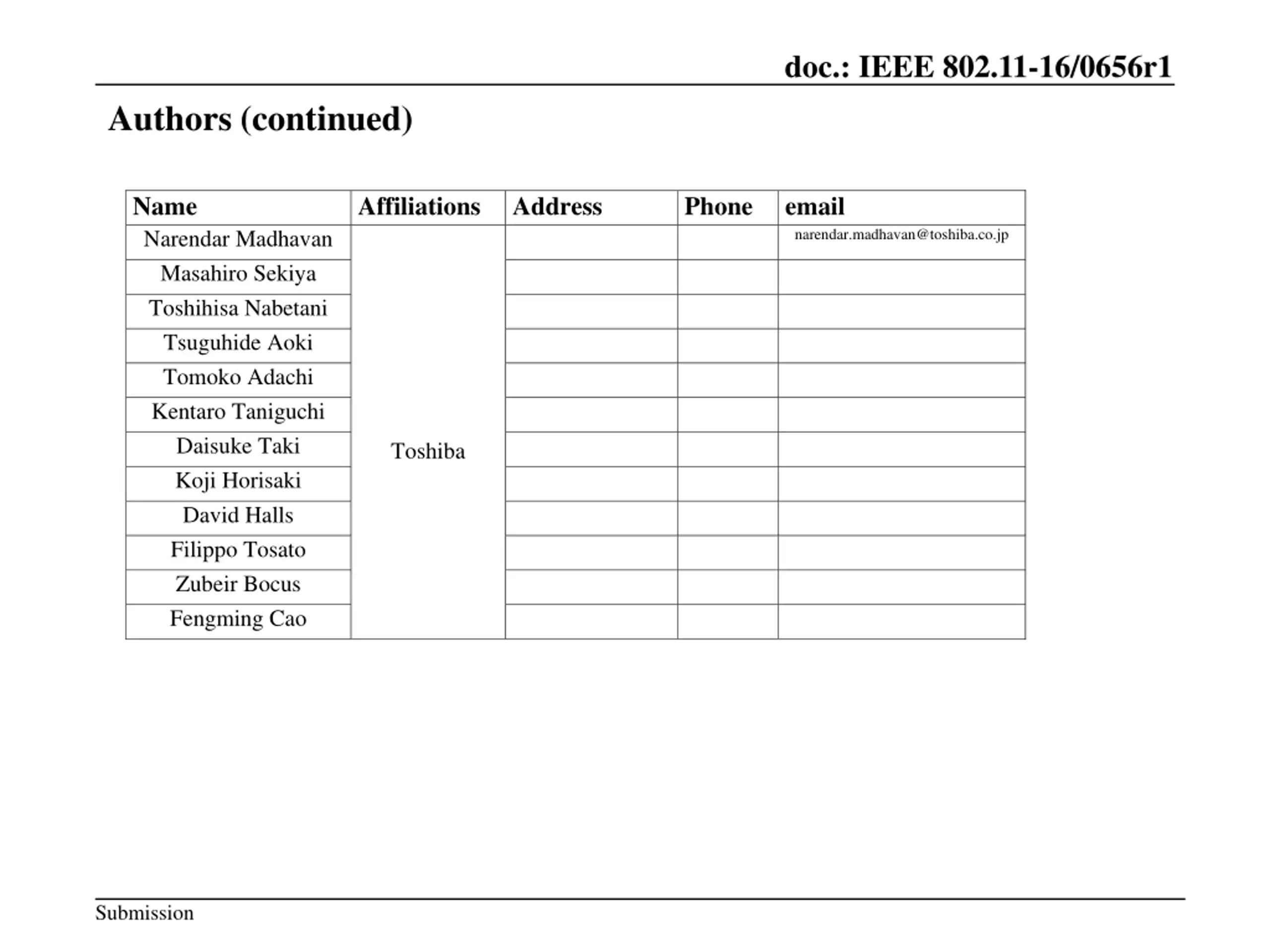 doc.: IEEE 802.11-16/0656r1 Authors (continued) Name Narendar Madhavan Masahiro Sekiya Toshihisa Nabetani Tsuguhide Aoki Tomoko Adachi Kentaro Taniguchi Daisuke Taki Koji Horisaki David Halls Filippo Tosato Zubeir Bocus Fengming Cao Affiliations Address Phone email narendar.madhavan@toshiba.co.jp Toshiba Submission