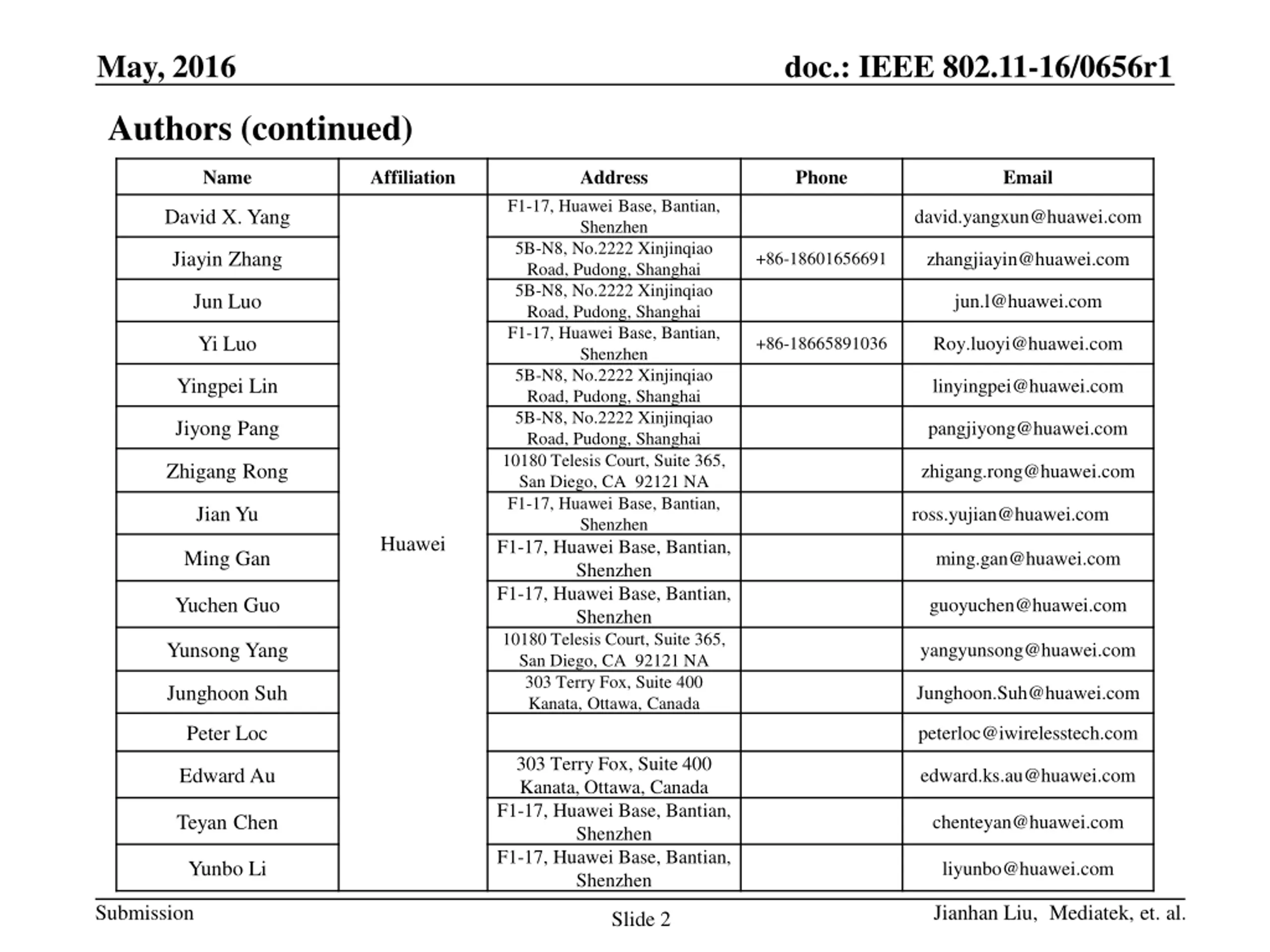 May, 2016 doc.: IEEE 802.11-16/0656r1 Authors (continued) Name Affiliation Address Phone Email F1-17, Huawei Base, Bantian, Shenzhen 5B-N8, No.2222 Xinjinqiao Road, Pudong, Shanghai 5B-N8, No.2222 Xinjinqiao Road, Pudong, Shanghai F1-17, Huawei Base, Bantian, Shenzhen 5B-N8, No.2222 Xinjinqiao Road, Pudong, Shanghai 5B-N8, No.2222 Xinjinqiao Road, Pudong, Shanghai 10180 Telesis Court, Suite 365, San Diego, CA 92121 NA F1-17, Huawei Base, Bantian, Shenzhen F1-17, Huawei Base, Bantian, Shenzhen F1-17, Huawei Base, Bantian, Shenzhen 10180 Telesis Court, Suite 365, San Diego, CA 92121 NA 303 Terry Fox, Suite 400 Kanata, Ottawa, Canada David X. Yang david.yangxun@huawei.com Jiayin Zhang zhangjiayin@huawei.com +86-18601656691 Jun Luo jun.l@huawei.com Yi Luo Roy.luoyi@huawei.com +86-18665891036 Yingpei Lin linyingpei@huawei.com Jiyong Pang pangjiyong@huawei.com Zhigang Rong zhigang.rong@huawei.com Jian Yu ross.yujian@huawei.com Huawei Ming Gan ming.gan@huawei.com Yuchen Guo guoyuchen@huawei.com Yunsong Yang yangyunsong@huawei.com Junghoon Suh Junghoon.Suh@huawei.com Peter Loc peterloc@iwirelesstech.com 303 Terry Fox, Suite 400 Kanata, Ottawa, Canada F1-17, Huawei Base, Bantian, Shenzhen F1-17, Huawei Base, Bantian, Shenzhen Edward Au edward.ks.au@huawei.com Teyan Chen chenteyan@huawei.com Yunbo Li liyunbo@huawei.com Submission Jianhan Liu, Mediatek, et. al. Slide 2