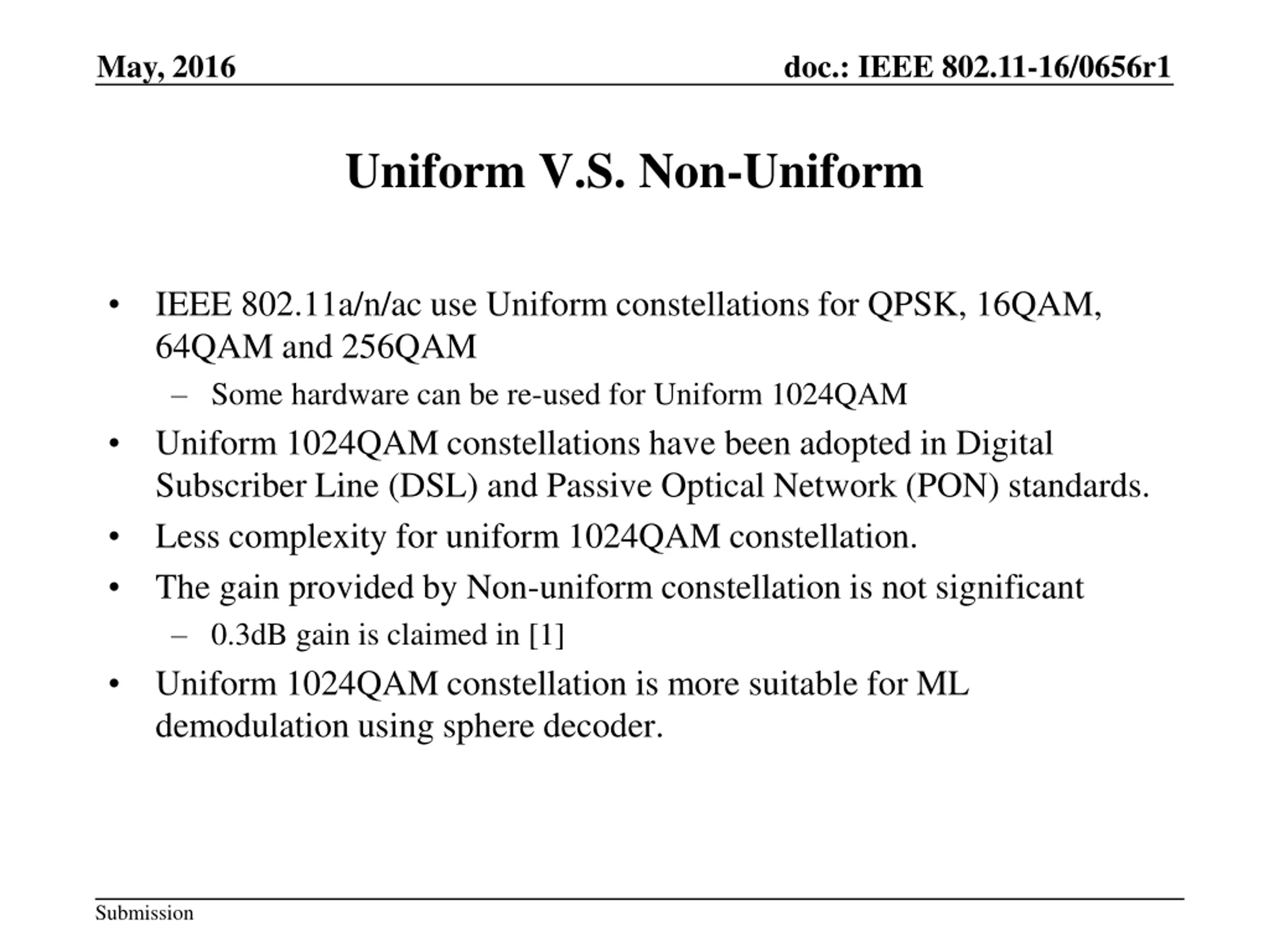 May, 2016 doc.: IEEE 802.11-16/0656r1 Uniform V.S. Non-Uniform IEEE 802.11a/n/ac use Uniform constellations for QPSK, 16QAM, 64QAM and 256QAM Some hardware can be re-used for Uniform 1024QAM Uniform 1024QAM constellations have been adopted in Digital Subscriber Line (DSL) and Passive Optical Network (PON) standards. Less complexity for uniform 1024QAM constellation. The gain provided by Non-uniform constellation is not significant 0.3dB gain is claimed in [1] Uniform 1024QAM constellation is more suitable for ML demodulation using sphere decoder. Submission