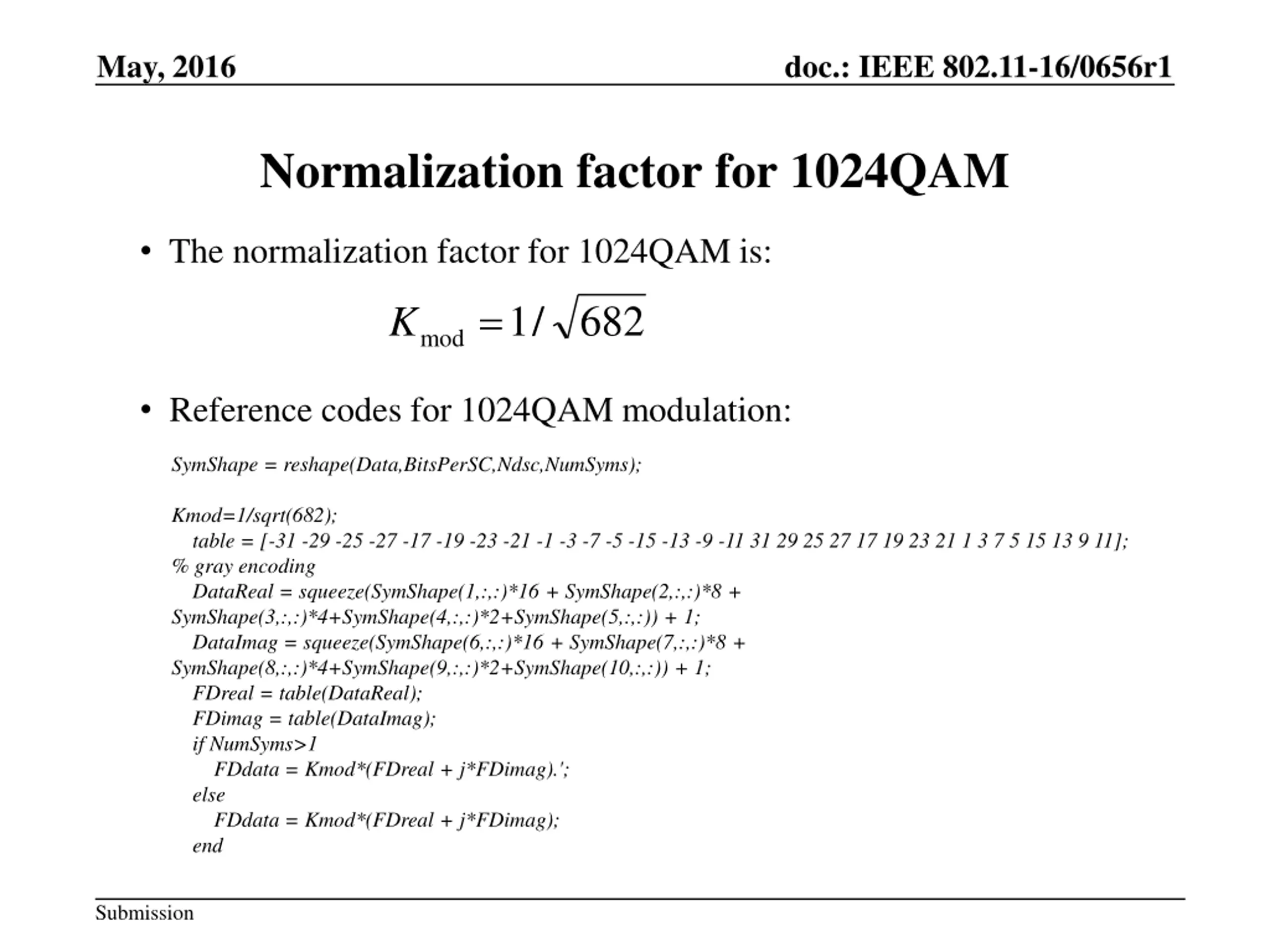 May, 2016 doc.: IEEE 802.11-16/0656r1 Normalization factor for 1024QAM The normalization factor for 1024QAM is: mod= / 1 682 K Reference codes for 1024QAM modulation: SymShape = reshape(Data,BitsPerSC,Ndsc,NumSyms); Kmod=1/sqrt(682); table = [-31 -29 -25 -27 -17 -19 -23 -21 -1 -3 -7 -5 -15 -13 -9 -11 31 29 25 27 17 19 23 21 1 3 7 5 15 13 9 11]; % gray encoding DataReal = squeeze(SymShape(1,:,:)*16 + SymShape(2,:,:)*8 + SymShape(3,:,:)*4+SymShape(4,:,:)*2+SymShape(5,:,:)) + 1; DataImag = squeeze(SymShape(6,:,:)*16 + SymShape(7,:,:)*8 + SymShape(8,:,:)*4+SymShape(9,:,:)*2+SymShape(10,:,:)) + 1; FDreal = table(DataReal); FDimag = table(DataImag); if NumSyms>1 FDdata = Kmod*(FDreal + j*FDimag).'; else FDdata = Kmod*(FDreal + j*FDimag); end Submission