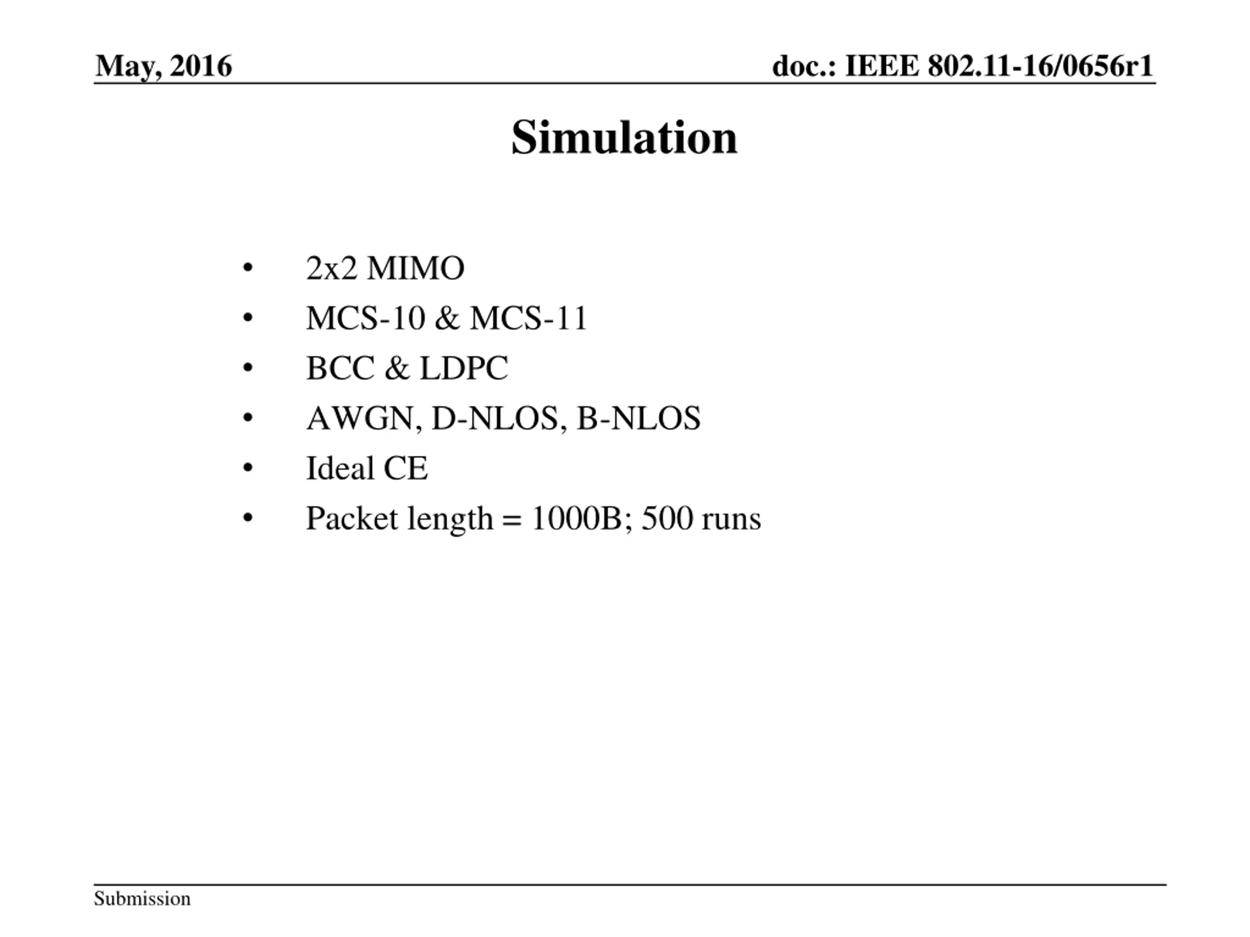 May, 2016 doc.: IEEE 802.11-16/0656r1 Simulation 2x2 MIMO MCS-10 & MCS-11 BCC & LDPC AWGN, D-NLOS, B-NLOS Ideal CE Packet length = 1000B; 500 runs Submission
