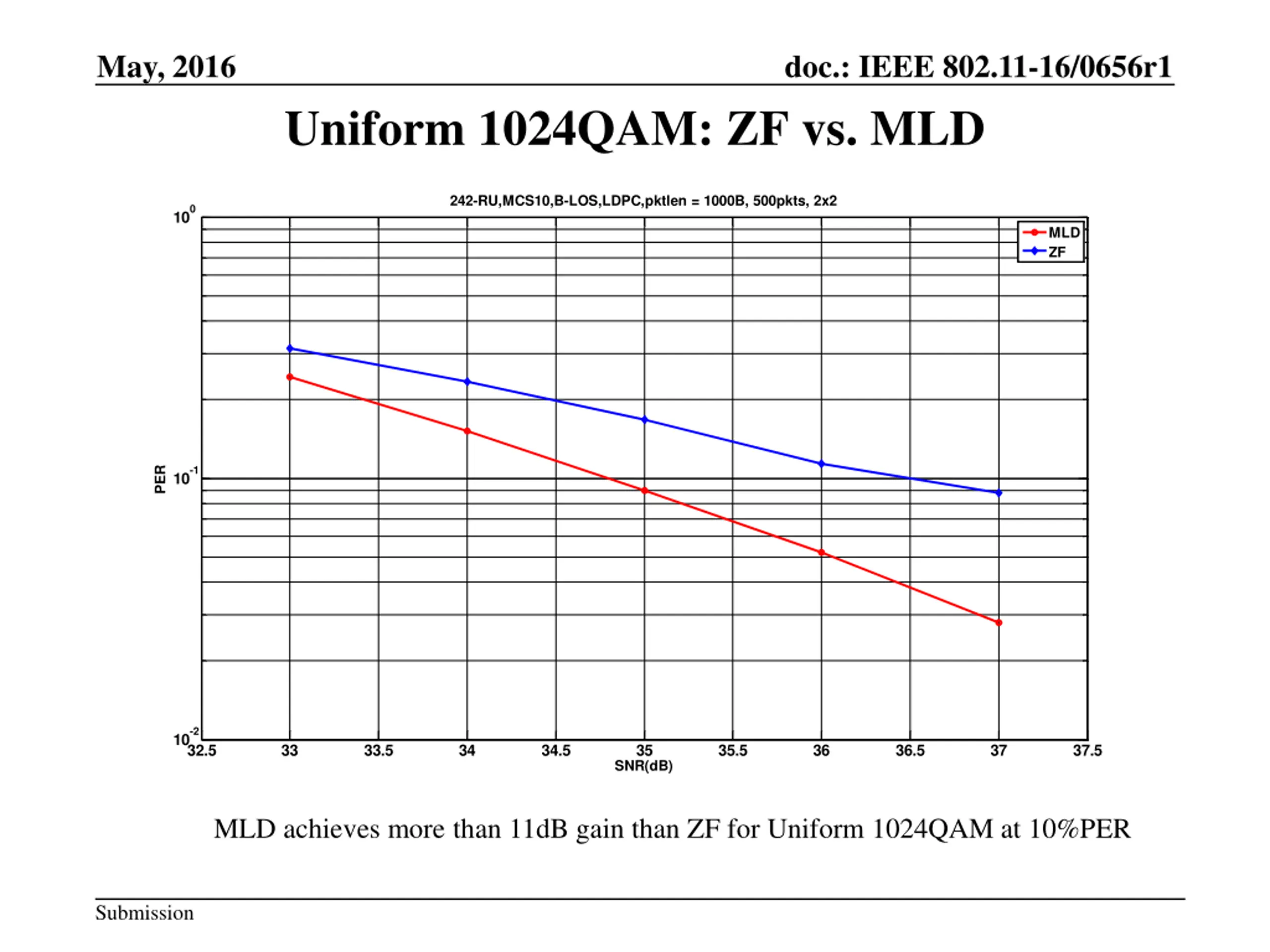 May, 2016 doc.: IEEE 802.11-16/0656r1 Uniform 1024QAM: ZF vs. MLD 242-RU,MCS10,B-LOS,LDPC,pktlen = 1000B, 500pkts, 2x2 0 10 MLD ZF -1 PER 10 -2 10 32.5 33 33.5 34 34.5 35 35.5 36 36.5 37 37.5 SNR(dB) MLD achieves more than 11dB gain than ZF for Uniform 1024QAM at 10%PER Submission