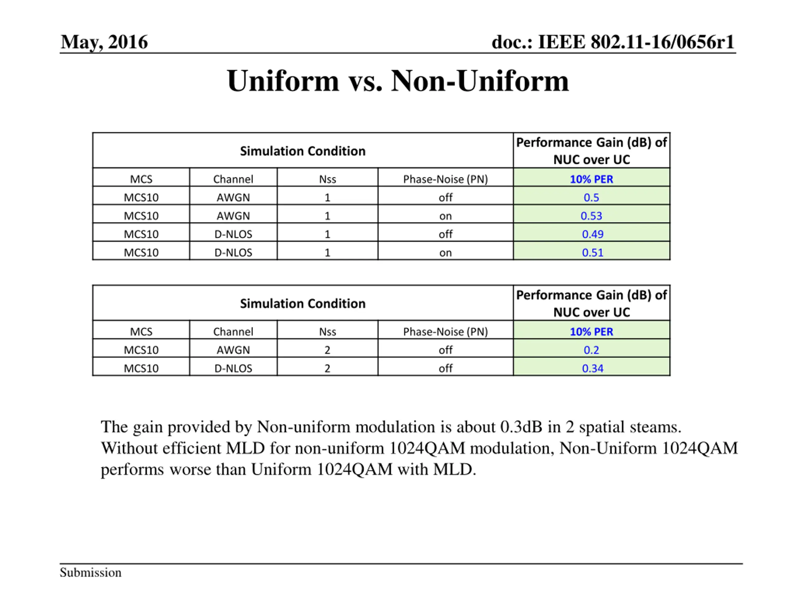 May, 2016 doc.: IEEE 802.11-16/0656r1 Uniform vs. Non-Uniform Performance Gain (dB) of NUC over UC Simulation Condition MCS Channel Nss Phase-Noise (PN) 10% PER MCS10 AWGN 1 off 0.5 MCS10 AWGN 1 on 0.53 MCS10 D-NLOS 1 off 0.49 MCS10 D-NLOS 1 on 0.51 Performance Gain (dB) of NUC over UC 10% PER Simulation Condition MCS Channel Nss Phase-Noise (PN) MCS10 AWGN 2 off 0.2 MCS10 D-NLOS 2 off 0.34 The gain provided by Non-uniform modulation is about 0.3dB in 2 spatial steams. Without efficient MLD for non-uniform 1024QAM modulation, Non-Uniform 1024QAM performs worse than Uniform 1024QAM with MLD. Submission
